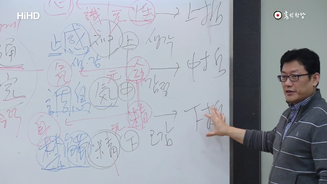 원랜 이 檀字는 꼭 그런 의민 아니에요. 그런데 이렇게 풀 수 있다는 거죠. 원래 檀字는 지금 따, 땅을 이렇게 다졌다는 거예요. 그 위에 집을 지어놓은 거죠. 祭壇을 쌓아놓은 걸 말해요. 땅을 단단하게 다져야 제단을 쌓죠. 그러니까 나무 중에 단단한 나무로 박달나무단자를 쓰는 겁니다. 그런데 단군에 박달나무단잘 쓸 땐 단단하단 의미를 취한 게 아니라 밝다는 의미를 취했어요. 박달나무. 해서 밝다. 밝은 임금. 그 태양처럼 밝다는 의미로 이 한자를 취했기 땜에 본 의미랑 다르게, 다르게 취해서 쓸 수도 있어요. 원래 한자는. 예. 그러니까 옛날엔 그림문자기 때문에 그 그림에서 어떤 이미지를 취할지는 쓰는 사람 마음입니다. 그래서 한 글자가 정말 다양한 뜻을 갖게 된 게 그 그림에서 취한 이미지가 달라서 그래요. 그래서 저것도 지금 제가 볼 때는 태양처럼 밝단 의미를 취했, 취했다고 봐야 됩니다. 단단한 임금이라고 단군이라고 하진 않았을 거 아니에요. 저 양반 꽉 막힌 양반이야. 뭐 이런 얘기로 쓰진 않았을테니까 예, 이렇게 이런 의미로 보셔야 돼요. 한문을 연구해 보면 이제 제 느낌을, 제가 말씀드린 느낌을 아실 거예요. 한 글자를 터무니없게 다른 뜻으로도 갖다 씁니다. 예. 그래서 그니까 아까같이 같을약자도 머리 푸는 거, 머리 정돈하는 모습이거든요. 같을약자가. 사람이요, 이런 글자예요. 머리를 이렇게 풀고 있는데 머리를 이렇게 잡고 있는 거. 데 왜 같을약잘까요. 알 수 없죠. 사실. 추리해보자면 머리라는 게 항상 같, 똑같게 정돈해야 되잖아요. 풀어헤친 머리를 늘 똑같이 정돈한다고 해서 같을약자같애요. 데 머리를 길게 늘어트렸다고 그래서 또 말을 이케 말, 이케 말 늘어뜨릴 때도 쓰고. 예-. 이에 이렇게 얘기하셨다. 이렇게 쓸 수도 있고. 데, 까 그 取한 의미가 진짜 다양합. 그래서 한자 저거 공부하는 거는 쉽지 않아요. 왜냐면 이 뜻은 도대체 뭔 의, 이 그림에서 뭘 취했을깔 따로 연구해야 돼요.