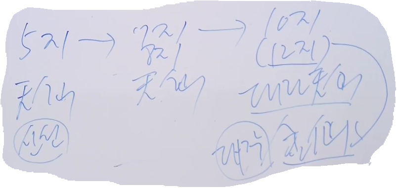 인선 천선 지선 얘기하다 여기까지 왔는데, 오늘 요, 요 부분은 도교의 이제 핵심 이론입니다. 요, 요걸 알고 도교 얘기를 들으시며는 이해가 잘 되실 겁, 예. 요거 좀 지우고. 어려, 어렵지 않으시죠? 어려우신가요? ㅎ 이해하기는 쉬운데 요걸 이제 체험할라면 어렵죠. 대충 이런 감각으로 보시면 돼요. 그래서 지금 삼일신고에서 말한, 인선 지선 천선 그러면. 인선 그리고 지선이면 에너지체 만드는 단계. 천선이면 이제 본격적으로 인성을 닦는 단계. 그니까 천선에서는 성통이 중요하고. 지선 단계에서는 생명을 얼마나 애, 생명, 근원적인 원기를 어떻게 복원하느냐가 관건이고. 인선 단계에서는 몸에 정력을 충만하게 하는 게 중요합니다. 이해되시죠. 이렇게 해서 나눠, 나눌 수 있다. 그래서 아까 그 천선 중에 마지막 그 궁극의 천선은 그, 그래서 이제 이, 이론 따라서, 요 얘기만 드려볼게요. 5지부터 천선이라고 부르는데, 실제로 5지는 신선이라고 부르는 經도 있다는 게 이게 아직, 제대로 된 천선은 7지 8지 가야 되거든요. 이 때부터 진짜 천선이에요. 그 다음에, 그럼 인제 10지나, 우리 다른 경에서는 12지 불지에 해당되는 요 겨, 요 단계는 뭐라고 할까요. 大羅天仙이라고 그래요. 대라천선. 아니면 금선. 大覺金仙. 뭐 대각을 붙이기도 하는데, 대각금선. 금선 그러면 원래 부처님을 짐 금선 그러는데 짐 12지 부처니까 금, 불교에서 가져온 거예요. 금선이란 용어는. 불경에 원래 나온 말이고, 원래 이제 도교식으로는 대라천선 그래요. 大羅天이 북극성이에요. 어, 그 우주의 하늘 중에 맨 꼭대기 하늘을 대라천이라고 그러거든요 금 거긴 북극성입니다. 까 북극성의 제일 어른 신선이 될, 그 10지보살급인거죠. 불교에서. 제일 꼭대기 신선·천선(10 혹은 12지), 그냥 천선(7·8지), 천선급이긴 한데 아직 그 이 제대로 된 성, 性 공부는 안 된 천선(5지).