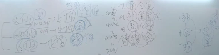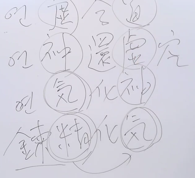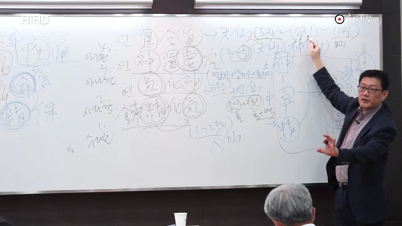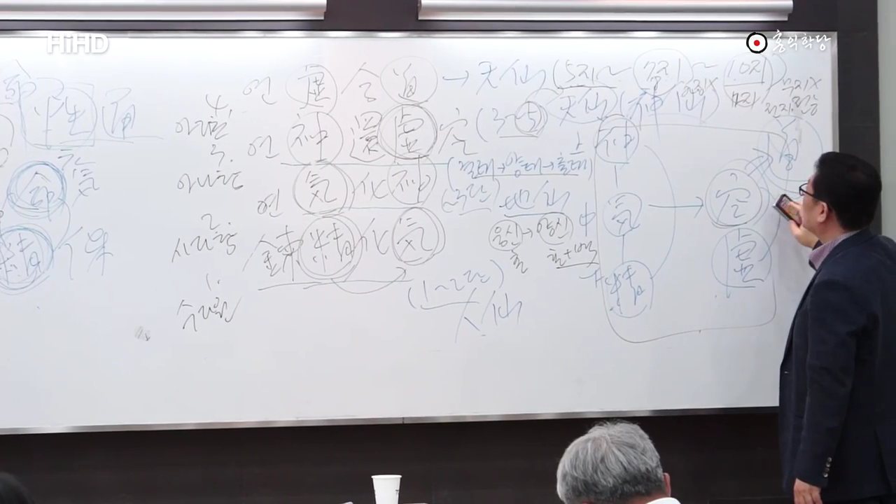 근데 이 물질적인 精보다 더 고차원적인 정기를 얻은 분들을 지선, 지구, 地上仙이라고 그러죠. 지상선. 天上仙, 천선들은요 이 道까지 얻은 분들이에요. 도까지 닦은, 도까지 이룬 분. 자, 이해되시죠. 근데 저것도 엄밀하게 들어가면 좀 구분이 돼요. 좀 여기서 보강 설명이 필요한데 겸사겸사 중국 도교 이론도 하나 소개해 드리고 할 거예. 중국 도교 이론 이것만 아셔도요 중국 도교의 레벨이 나옵니다. 이런 말 들어보셨어요? 鍊精化氣. 볼게요. 연마할연자 써 가지고요, 예, 연정화기. 정액을 기운으로 바꾼다. 예요. 정액을 鍛鍊해서 기운으로 변화시킨. 예. 연, 그 다음에 연기, 鍊氣化神. 정기신을 이렇게 닦는 거예요. 아래 정에서 시작해서 기를 불리고, 그 기를 단련해서 예, 연기, 우리말로 쓸게요. 연기화신. 신. 정신을, 로 변화시키고. 설명을 좀 있다 드릴게요. 鍊神, 예, 이 때는 還 그럽니다. 환. 돌아가게 한다. 虛. 허, 허가 空이에요. 불교에서. 신을 단련해서 고, 공으로 돌아가게 한다. 鍊虛合道. 연, 허를 닦아서 도랑 일치시킨다. 자, 1(鍊精化氣) 2(鍊氣化神) 3(鍊神還虛) 4(鍊虛合道). 불교에서 開雲祖師같은 분들이 돌아가신 뒤에요 지리산에 지금도 돌아다니신다고 계속 보고가 되고 있어요. 믿거나 말거나지만.