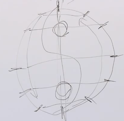 거기에 이제 재밌는 게, 다른 경전에선 이런 게 드문데 그 이런 오래된 경전에서 이렇게 단, 우리가 단학이라고 하는 에너지 수련 하는 원리들이 나와서 이제 제가 이 재밌어서 말씀드렸는데 늘, 이 태극을 이렇게 그려도 되고 저렇게 그려도 됩니다(돌아가는 방향). 제가 보통은 반대로 그리다가 이렇게 그릴 때는 이게 이 우리 인체로 말하며는 이, 이렇거든요. 인체로 말하면요 督脈이, 陽氣가 올라가는 脈이 뒤에 있고 이 내려오는 걸 맡은 脈이 앞에, 陰脈이 앞에 있어서요, 예, 그래서 이 여기다가 그립니다. 그래서 실제로 그러면 여기 등이 그러며는 남쪽이고 앞이 북쪽이냐? 그건 아니구요 저, 陽이 양기가 있으며는 우리가 이제 흔히 생각에 양기가 있는 쪽이 남쪽이고 음기가 있는 쪽이 북쪽 같은데. 고게 아니라, 예, 앞이 남쪽이고 당연히 우리 등 뒤가 북쪽인데, 북쪽 안으로요, 그래서 북쪽 안으로 이 또 卦를 그리자니 어려워 질 거 같고. 암튼 북쪽 안으로, 음산한, 안은, 이 음기가 있고 앞에 陽 쪽이 있는데 陰氣 안을 陽氣가 뚫고 올라가는 겁니다. 그런 형국이구요, 예, 앞에 있는 남쪽을, 남쪽으로 또 이제 陰氣가 흘러내리는 거예요. 陰陽이 교, 서로 조화를 이루는 측면에서 이해하시며는, 좀 헷갈리실까봐 말씀드렸는데. 그래서 인체를 그릴 땐 이렇게 그려요. 왜냐면 기운이 꼭 뒤로 올라가요. 수련을 하면. 물론 앞으로도 올라가요. 예. 그런데 이제 일반적으로 이렇게 돌아가는 게 정석이거든요. 그래서 우리가 會陰部부터 시작해서 꼬리뼈 부위, 배꼽 뒤쪽, 심장 뒤쪽, 목 뒤쪽, 에, 정수리, 엣 아저 뒤통수, 그 다음에 정수리 해서 인체를 이렇게 해서 올라갑니다. 그래서 또 앞으로 그대로 상응점에서 반대로 이렇게, 다 상응점들이 있죠(같은 높이의).