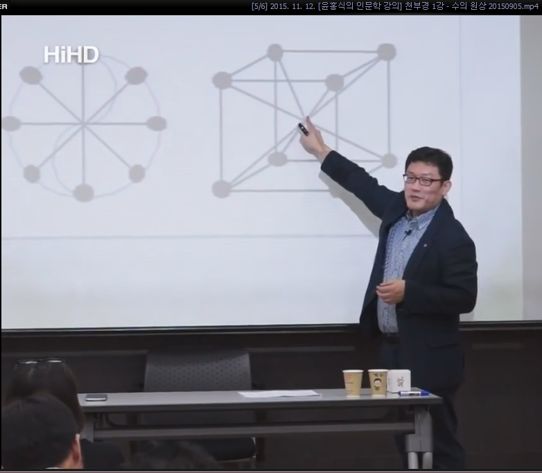또 그러면 분열이 있으면 통합이 나옵니다. 그래서 3이라는 숫자의 의미를 또 생각해보세요. 위아래로 짝 찢어졌는데 양과 음으로 찢어졌는데 중간자가 하나 또 등장했죠. 통합을 시키겠다는. 이게 가정으로 치면 父母가 있으면 자식이 나오는 거고 쿼크나 이렇게 3이 돼야 안정을 찾는거 . 사람은요 또 3이 돼야 조직을 이룹니다. 도원결의는 둘이서 안 해요. 셋이서 하지. 둘이서 하면 그냥 조직으로 안 봐줘요. 셋이 해야 여긴 조직이구나라고. 예전에도 말씀드렸습니다. EBS에서 제가 보고 재밌었는데 실험을 하는데, 언제부터 무리로 보는지 실험을 하는데 횡단보도를 걷다가 한명이 탁 쳐다봐요 하늘을. 아무도 안 봐요. 두 명이 쳐다봐요. 또 안 봐요. 그런데 세 명이 쳐다보면요 로고스 적으로 우리가 명령을 받는 겁니다. 이거는 무리가 쳐다보는 거고 안 끼면 바보다라는 생각이 들어 같이 쳐다봐요. 그러니까 세 명이 뭘 하면요 그 땐 같이 움직여요. 조직으로 봐줘요. 재밌죠 이게 우리 정신에도 요 로고스가 들어있는 겁니다. 그래서 항상 가위바위보를 해도 세 판은 해야 뭔가 이렇게…. 두 판을 하고 뭐 한 판하고 이건 불안하잖아요. 찜찜하잖아요. 항상 이 뭔가 이 우리도 삼박자 사고를 제가 하자고 하는 것도, 이 양 음 합 정도는 생각해 봐야 뭔가 사고가 정밀해지거든요. 재밌죠. 변증법도 이겁니다. 정반합. 한 번 세 번은 굴러야 이놈이 쓸 만해 진다. 하는 요런 발상도요 우리 머릿속에 3이라는 숫자가 갖고 있는 어떤 그게 있죠. 통합의 느낌. 그래서 둘로 쪼개진 모든 거는요 둘은 이미 분열상이라서요. 사람들이 둘에 대해선 불안해 하는거예요. 찢어져있기 때문에. 합치고 싶은 거예요. 그래서 결국 이게 음과 양이 합일이 되는데 이게 이제 부모나 뭐 아까 얘기해 드린 거구요. 사람이나 이런 쿼크에 있어서도 꼭 3이라는 숫자가 이것도 제가 물리학 박사한테 들은 건데 꼭 셋이 돼야 이게 안정된대요. 이 신기하다고 하더라구요. 그럼 이 우주가 보이지 않는데서 명령을 하고 있는 거죠. 그렇게 하라. 그 명령을 지금 우리가 읽어내자는 겁니다. 우주에 새겨진 숫자의 의미. 3이라는 숫자가 갖고 있는 의미는이렇게 음양의 합이고, 그래서 모든 입체물은요 여기서 이제 어떤 우주가 본질적으로 우주가 우리가 존재하는 형이하의 존재만 봐도 우주는 3이란 숫자를 가지고 우주를 만들었구나 하는 걸 어디서 볼 수 있다구요? 일단 하나라는 건 한 덩어리로 내는걸 보면 하나라는 숫자를 우주가 갖고 우주를 만물을 만들었다는 걸 알 수 있지만 둘이라는 숫자는요 음양. 셋은요 음양이 있으면 반드시 중간이 있더라는 겁니다. 그것도 알 수 있고 또 하나는요 위아래 하면 또 중간이 있어서 셋이 어우러진다. 중심을 말 할 수도 있고 또 3이란 숫자는 xyz축을 말할 수도 있어요. 우리가 살아가는 물질적으로 이 3차원 공간의 세계에서는요 반드시 세 가지 축을 갖고 있죠. x축 y축 z축 그러니까 결국 우리는 3이라는 숫자 속에서 살아가고 있다는 겁니다. 우리도 모르게. 그래서 이 철학자들은요 그거를 연구해가지고 밝혀낸 거예요. 원래 있는 이런 수리적인 질서를 지금 1 2 3까지 오면요 이것도 계산할 수 있겠죠. 요게 지금 뭐죠? y축 x축 z축 하죠 그러면 여기 지금 이 입체물이 여기 있다면 이해되시죠.