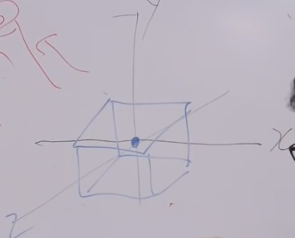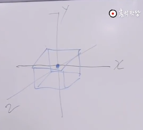 좀 복잡하지만 아무튼 여기가 이 중심이라고 치고 이런식으로 xyz가 이 하나의 입체물이, 여러분의 몸도 존재하려면 저 세 축이 있어야 존재한단 말이에요. 그래서 동양에서 천지인을 중시하는 것도요 이 3이라는 숫자가 만물을 낳는다는 것에 대해서 확고하게 알고 있는 겁니다. 이 질서를 그걸 수리적으로 표현하면 이렇게 돼요. 자 그 다음에.