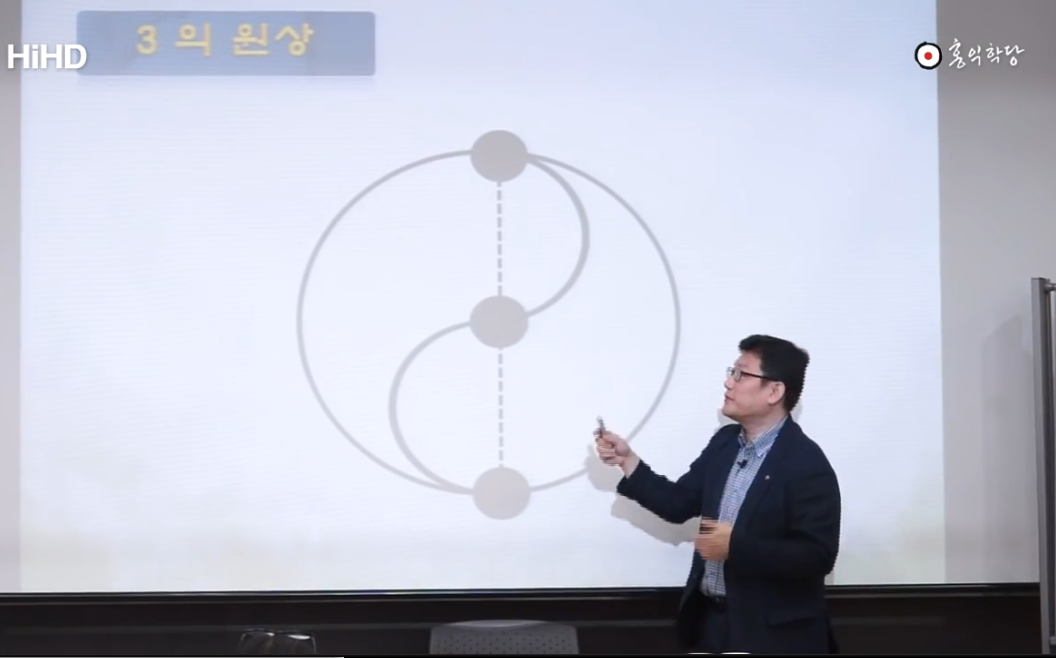 무극의 바다에 또 작은 태극이라는 파도가 일어났다. 작다고 할 수 없죠. 여기서 우주가 나오니까. 아무튼 무극의 바다에서 태극의 파도가 일어났다 말았겠지만 무극이 본체면 태극은 작용이거든요. 아무튼 우주가 시작되려면 알이 있어야 됩니다. 초점이. 고게 이제 태극인데 또 이 그림을 이렇게도 해석할 수 있죠. 여기가 태극이고요 여기가, 태극은 결국 우주의 씨이라는 의미이기 때문에 우주를 상징할 수 있어요. 만물, 현상계. 이해되시죠. 현상의 근원이다. 아니면 무극의 초점이다라고 말할 수도 있죠. 두 개가 다 가능하고 중국 도가서에도 두 방향으로 풀이를 다 합니다. 그래서 아무튼 이게 태극은 결국 1이란 숫자. 무극은 0이란 숫잔데. 황극은요 요놈이 사방, 최소한 사방을 경영할 때 황극 그래요. 그러니까 5라는 숫자가 됩니다. 1 2 3 4 5. 이해되시죠. 수리적으로 5 그러면 5황극. 동양에서는 대대로 5를 황극 그럽니다. 그래서 이 한자 자체도 5에는 황극이라는 의미가 있어요. 하늘 땅(위 아래의 두 가로획) 하늘과 땅을 중간에서(가운데 X모양) 경영하는 존재. 그러니까 천지의 중심에 선 사람이라는 뜻이 있어요. 5가. 황극에는 꼭 5를 씁니다. 이게 지금 우리 한자의 五字의 원형이죠. 그래서 재밌는게 삼천양지 그러죠. 하늘은 숫자가 3이고 땅은 둘입니다. 1은 태극이니까 1에서 하늘이 나오니까 1이 원래 홀순데 홀수가 양순데 홀수중에 1은 태극이 먹으니까 3을 하늘이 먹어요. 짝수는 음수니까 2를 땅이 먹어요. 그래서 이 숫자는 하늘과 땅을 합치면 어떻게 되죠? 5라는 숫자가 나오죠. 그래서 이제 수리철학 이런거 하는 분들은 이걸 가지고 이제 장난을 치는데 저는 여기까지만 해서 3과 2라는 숫자가 三天兩地 주역에도 나옵니다. 兩은 ‘두 양’ 字예요. 셋이 하늘이고 땅은 둘이다 하는 게 이게 주역의 기본 사상이고 괘를 만들 때도 하나 둘 셋이죠(陽爻는 하나가 세 칸인 것) 음은 하나 둘(陰爻는 가운데가 없으니 두 칸짜리). 그래서 삼과 둘이 먹죠. 이해되시죠. 또 하늘은 똥그랗고, 우리 常平通寶같은 그 화폐 봐도. 네모가 땅인데 하늘이 크기 셋을 먹으면 땅이 둘을 먹는다. 하늘 안에 땅이 있으니까. 그리고 이 네모, 사각형으로 땅을 상징합니다. 이해되시죠? 사람은 여기다 삼각형만 그어주면(네모의 꼭지점끼리 이으면 삼각형 네 개 나옴) 삼각형이 사람이에요. 머리를 위에 쳐들고 발은 두 개, 머리는 하나이고.(원의 중심이 생물의 머리랑 겹침) 발을 위로 쳐들고 머리가 하나인 존재, 이렇게 하면 이건 식물입니다. 머릴 옆으로 쳐든 존재. 동물들. 예 이렇게 해서 하늘 땅 생명체들을 다 하나로 그릴, 이렇게 그리고 이 때 중심의 태극이 알이에요. 요 태극에서 하늘이 나오고 태극에서 땅이 나오고 태극에서 각종의 생명체들이 나온다. 요게 이제 이 그림 하나로 동양의 모든 철학을 설명합니다. 천부경은요 이런 원리를 풀어놓은 거기 때문에 이 그림 하나만 이해하시면 천부경 다 이해하신 거예요. 天符三印이 뭐라구요? 동그라미 네모 세모. 이해되시죠. 여기까지만 할게요. 더 들어가면…. 안 어려우시죠? 그래서 최근에 그 생명평화무늬가요 어떤 단체에서 요런 거 그려서 하던데요. 식물 사람 요기 똑같은 그림을 그리더라구요. 발 네 개 달렸고, 들짐승. 뭐죠? 이렇게 날짐승 물고기 이래가지고 생명평화무늬라고 쓰시던데 어떤 단체에서. 요게 사실 옛날 우리 조선 선비들이 항상 하는 얘기예요. 제가 지어낸 게 아니고 조선 선비들이 항상 식물은 머리를 땅으로 쳐 박고 있고, 사람은 머리를 위로 쳐들고 있고, 동물은 횡으로 머리를 하고 있다. 요게 이제 기본 철학입니다. 이게 보이시나요? 예.