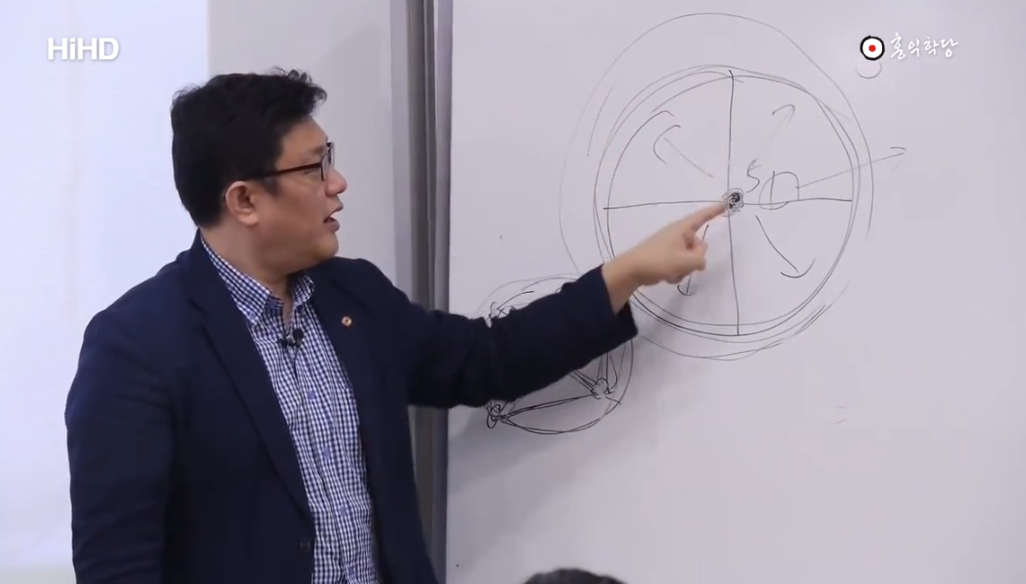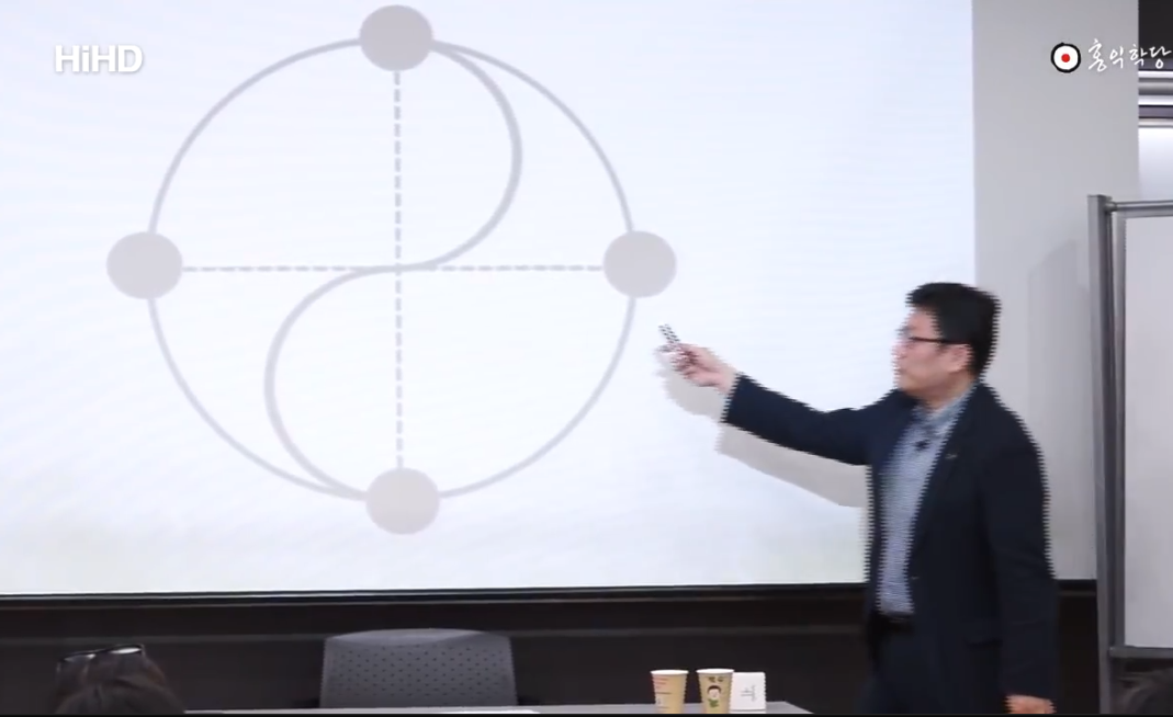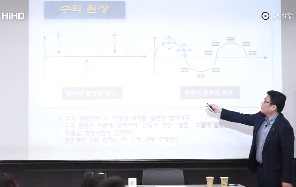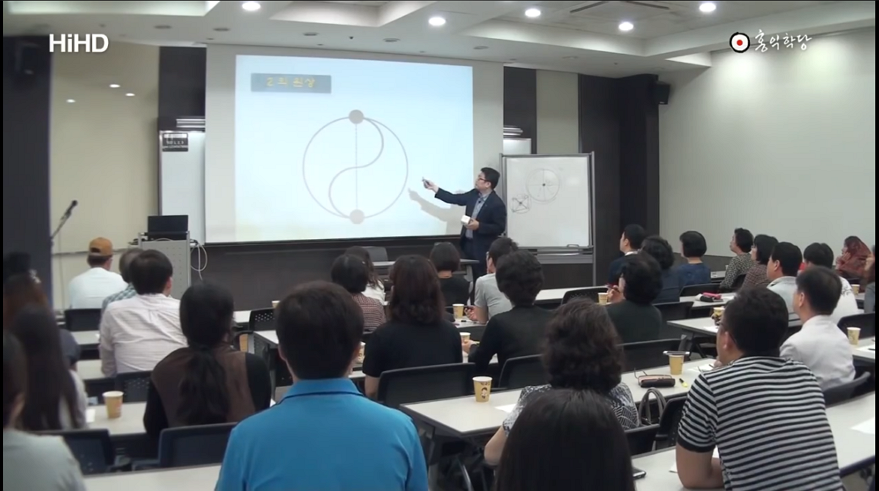 이번에는 五行으로 그려야 되거든요. 자 보세요. 아까는 사상으로만 봤는데 다섯 개를 가지고 보면요 가운데까지 끼어서 보는 거죠. 그러면요 이렇게 볼 수 있어요. 자 타오르는 쪽(왼쪽) 여기는 木. 여기(위)는 뜨거운 불. 여기(오른쪽)는 흘러 아 뭐죠? 예 그냥 서늘한 정도의 쇠. 아주 극랭의 물(아래). 예 기운이 다 다릅니다. 쪼그라들게 하는 기운이에요. 金기운은요 쪼그라들게만 해요. 水기운은 아주 얼어붙게 만들어요. 木기운은 이렇게 통하게 해줘요. 따뜻하게 온화하게 펼치게 해 주고 여긴 뜨거워요 火기운은. 가운데 土기운은 중간을 잘 잡고 있고. 土는 또 물을 머금는 자리니까 土剋水기 때문에 물이 흐르는 걸 머금어 딱 머금는 자리가 톱니다. 그래서 물을 토가 머금고 있기 때문에 木剋土라고 木이 땅에서 또 솟, 생명이 밖으로 발산될 수가 있어요. 이런 상생상극을 통해서 이렇게 돌아가는데 이런 관계속에서 지금 이 다섯 개의 에너지를 지금 5라는 숫자로 표현할 텐데 보세요. 그래서 이 오행은 자라남, 저기 글자 있습니다. 쪼그라듦, 타오름, 흘러내림. 촉촉함이라는거는 땅이 물을 머금고 새로운 생명을 낳을 수 있는 중심 토대라는 걸 말하는 거구요. 또 五德으로 말하면 온화함 서늘함 또 조화로움 지혜로움 성실함으로 말할 수 있다는 거. 이건 인의예지신입니다. 예. 봄처럼 사랑하고, 온화하고, 가을처럼 서늘하고, 추상같은 에너지죠. 정의, 사랑, 여기는, 여름은 모든 만물이 밖으로 발산될 때라 조화를 잃어버리면 큰일 나요. 조화를 이뤄야 돼요. 서로 예절 안 지켜주면 사람들이 많이 모이면 어떻게 돼요? 서로 예절 안 지키면 개판이 되는 거죠. 그래서 이 여름의 덕목은 조화로움을 말 하는 겁니다. 물은요 밖으로 이 아주 극랭의 물은요 안으로만 쪼그라들어 있어도 그 안에 생명의 모든 정보가 다 있습니다. 그래서 지혜로움. 땅은 안정감이죠. 늘 이런 온화하고 정의롭고 조화롭고 지혜로운 덕목들이 늘 안정적으로 돌아가는 걸 도와주는 거기 때문에 덕목으로 말하면 성실함. 그래서 仁義禮智信 이렇게 얘기할 수 있습니다. 이런 다섯 가지 color가 제가 이렇게 다 해 놓은 이유가요 각 숫자마다 갖고 있는 이런 특성들이 하나에서 계속해서 저런 다양한 속성을 통해서 발현된다는 겁니다. 그래서 우리는 이런 다양한 속성이 우연히 주어진 것처럼 생각하지만 우주에는 질서에 의해서 이런 게 나온다는 거죠. 서늘하고 조화롭고 지혜롭고 이런 것들이요 그냥 나오는 게 아니라 어떤 쪼그라들고 자라나고 그러니까 여러분 이 오행의 원리를 아시면요 길 가다가 풀 한 포기만 봐도 그 안에서 오행이 구현되고 있는 게 보여요. 한 쪽은 자라가겠다고 온 힘을 다 쓰고 있는 게 보이고요 경이로움이 느껴집니다. 눈에 보이는 건 현상인데 그 안에 있는 로고스가 보여요. 우주의 근원의 생명이 보여요. 우주의 프로그램이 보인다구요. 한쪽은 자라겠다고 한 쪽은 쪼그라들겠다고 한 쪽은 또 뭐 타오르고 있죠. 불처럼 타오르고 있고, 또 흘러내리는 물을 통해서 식물이 또 힘을 얻고. 이런 한 식물에서 발현되는 로고스만 봐도 재밌습니다. 그래서 이런 것도 그 혹시 다큐 같은 거 보셔도요 수정란은 아무 형체가 없죠. 그냥 똥그랗죠 뭐 특색이 없죠. 이 수정란이 쪼개지기 시작하면서 이제 세포가 어마어마하게 분열되죠. 그런데요 그 분열된 세포들 간에 나중에 보면 그 다큐 보세요. 애가 하나 그게 커서 애가 되는 과정을 보면 기가 막힙니다. 처음에 이 뭉툭한 이게(손 부분) 보세요. 이거는 발산하고 한 쪽은 쪼그라들면서 손가락이 만들어져요. 칼같이 우주에서 명령을 내려서 이쪽은 계속 발산하구요 이쪽은요 계속 쪼그라들어요. 그러면서 개구리손처럼 됐다가 점점 우리가 보는 손으로. 그러니까 이 음양의 조화를 통해서 손가락 하나 뭐 하나 다 만들어집니다. 이게 신기하죠. 어디서 명령 내리는 데가 없는데. 우리가 DNA의 명령이라고 쉽게 얘기하지만 DNA의 명령이라는 게 그렇게 쉬운 얘기가 아니에요. 무형의 세계에서 명령이 계속 와가지고 유형의 세계를 질서정연하게 만들어놓는단 말이죠. 그래서 이 세포를 떼다 이쪽에다 놔도 이 세포가 또 거기 場에 바로 합류해서 그 귀를 만드는 데, 또 신체 각 부분을 만드는 데 협조해요. 그러니까 세포를 서로 다른데다 옮겨 놔도 거기 가면 또 거기 명령을 듣습니다. 이런 거 보면 기가 막히죠. 생명체가 살아가는 모습을 수리로 얘기해 놓은 거지 이게 지금 제가 추상적이라고 얘기했지만 세상과 동떨어진 추상적인 게 아니구요 이 원리들이 현실에 그대로 쓰이고 있습니다. 그 현실에서 우리가 추출해 낸 거죠. 이런 원리들을. 그런데 결국 현실에서 공통적으로 발견된 원리들은 우주의 근본적인 프로그램이겠죠. 그걸 로고스라고도 말 할 수 있는 겁니다. 한 편으로는 현실에서 발견되는 질서고 한 편으로는 우주의 근본적인 질서이자 프로그램이고 이렇게 접근해 보시면 재밌을 거 같습니다.