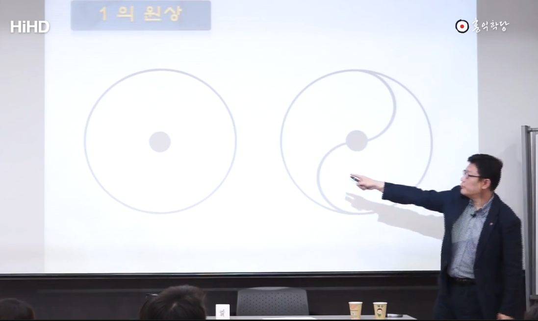 엄청난 가능성을 품고 있는 하나죠. 우주 만물을요 지금 태극이 우주 만물을 표현했다고 그래도 지금 우리가 본 게 다가 아닐 거예요. 무한한 시간동안 또 무한하게 표현해도 끝이 없을 겁니다. 왜냐하면 원주에 있는 점은요 비유로 얘기하자고 해도 원주에 있는 점도 무한해요. 요 두 점을 찢으면 또 이 안에 무한한 점이 있습니다. 그래서 수학적으로요 이 원주의 점은 유한해보이지만 사실은 무한해요. 즉 만물은 무한하다는 걸 상징할 수 있겠죠. 이 그림이. 그런데 무한한 만물의 중심은 무조건 하나예요. 그런 측면에서 이 하나라는 건 우주를 낳은 하나라는 것까지도 한 번 생각해 보시라는 겁니다. 여기에도 하나가 등장하고 또한 형이하학적으로도 이게 한 덩어리라는 의미에서도 하나고요, 형이상학적 하나는 우주에 존재하는 모든 것의 근원으로서 하나라는 숫자를 우리가 생각해 볼 수 있고, 형이하학적으로는 그냥 이게 한 덩어리라서 하나. 이렇게 생각해 볼 수도 있습니다. 그런데 하나는요 이게 한 덩어리라고 하더라도 반드시 둘로 쪼개지죠. 둘을 품고 있습니다. 지금부터는 이런 원리로 진행돼요. 하나가 둘로 찢어졌죠. 또 셋이 등장해요.(둘의 가운데) 셋이 또 둘로 찢어지겠죠.(가운데가 둘로) 그럼 넷이 등장하죠. 가운데 또 하나가 등장하고. 그래서 통합과 분열의 반복이에요. 하나는 통합이었죠. 그러면 통합 뒤에는요 반드시 분열이 옵니다. 그래서 주역에서 一陰一陽이 道다 그래요. 한 번 陰해지고 한 번 陽해지고. 왜냐하면 태극이 우주의 주재자인 동양의 하느님입니다. 우리나라는 국기에다가 동양의 하느님을 그려놓은 거예요. 동양의 하느님이 우주를 굴리는 방식이 뭡니까? 양과 음이에요. 一陽一陰. 발산했다 수렴했다 발산했다 수렴했다 진동을 통해서 우주를 경영하기 때문에 통합했으면 또 찢어져야 맛이죠. 그래서 하나는 반드시 또 둘이라는 거를 또 내포하고 있습니다. 그 안에. 그래서 모든 것에는 양면이 있다. +가 있고 -가 있다. 발산이 있으면 수렴이 있구요 통합이 있으면 분열이 있습니다. 또 남녀가 있고 빛과 어둠이 있고 움직임과 고요함이 있습니다. 움직였으면 또 멈춰요. 자 이렇게 해서 또한 이런 로고스를 이 둘이라는 숫자가 갖고 있다는 것도 생각해 보시고요 또한 형이하학적으로 모든 입체물은 간단하게 상하 위아래 두 개의 극치점을 갖고 있다. 앞뒤거든 좌우거든 뭐든지 간에 이원성을 갖고 있다. 여기서 이제 음양이라는 이 둘이라는 숫자가 갖고 있는 로고스적 측면을 보면요 주역으로 말하면 乾과 坤이요. 발산과 수렴. 요건(☰) 양만 세 개죠. 양은 쪼개지지 않았죠. 그래서 이 아주 강하게 발산하는 힘을 상징하구요. 수렴은요 다 쪼개져 있는 것들(☷)입니다 곤괘는. 곤괘는 쪼개져 있는 입자들이 뭉쳐가지고 땅을 만드는 거예요. 수렴을 상징하구요 하늘은 발산을 상징하구요. 꼭 이거는 뭐 팽창만 해야 된다는 건 아니지만요 이 양은 발산의 성질을 가지고 있고, 음은 수렴의 성질을 갖고 있기 때문에, 에너지는 기고 물질은 그 땅인데 형체인데. 동양의 음양관으로 말하면 기는 양이고 물질은 음이죠. 덩어리 있는 것들. 덩어리 있는 거랑 덩어리 없는 거 관계에서는 덩어리 없는 게 발산이라는 게 요게 주역의 기본 공식인데 요즘 과학자들이 쓰는 용어에도 똑같이 씁니다. 그래서 우주를 팽창하는 힘과 수축시키는 힘이 어떻게 균형을 이루는지는 지금 팽창 쪽인지 수렴 쪽인지 또 우리가 멀리 관찰해봐야 되니까 또 결론은 관찰해 봐야 결론이 나오겠지만 이거는(☰) 형체 없는 겁니다. 형체 없는 한 덩어리. 하늘이 한 덩어리죠. 하늘은 쪼갤 수가 없어요. 형체가 없기 때문에. 땅은요(☷) 쪼개진 것들이 입자들이 모여서 이 흙을 이루고 있고 물질을 이루고 있기 때문에 쪼개져있죠. 그래서 수렴한다는 게 본성이고 양은 발산한다는 게 본성입니다.
