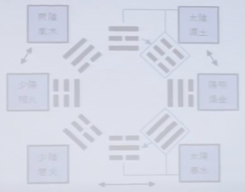 음이 세 개인 게 太陰濕土. 자 태음습토 陽明燥金 太陽寒水 少陰君火 少陽相火 厥陰風木 요정도 이름이 있다는 것. 6기가 있다는거. 여섯 개의 에너지로 분류할 때는 이렇게 분류해서 지금 한의학에서도 쓰입니다. 여러분 몸을 연구할 때도 쓰이고. 자 君火相火는 뭘까요. 君은 임금이에요. 心臟 불이요. 상화는요. 腎臟에 있는 불이죠. 원래. 相은 ‘도울 상’자 ‘재상 상’자죠. 도와주는 불. 君은 임금 불. 여러분 몸의 주된 불이고 相은요 宰相불이에요. 협조하는 보조적인 불. 그래서 陽이 작죠. 그런데 군화는 양이 맨 꼭대기에 있죠. 임금 위치에 있어요. 양이. 그럼 군화. 양이 맨 밑에서 이렇게 도와주면 이제 소양상화. 양이 꽉 찼으면 태양 그러고 그런데 재밌는 게 이건 易을 정말 알아야만 알 수 있는 얘긴데요. 이거 그 어디에 있는 얘긴 아니에요. 제가 주역을 전공했기 때문에 이 한의학에서 쓰는 이런 육기개념을 제가 괘에다가 배당해본 겁니다. 지금. 괘에다 배당할 때 제가 이걸 보면 재밌는 게 태양이 한수 물이 되는 게요 태양은 지금 乾인데 결국은요 先天卦에서는 乾坤이 중요하죠. 그냥 이거는 귀에 뭐가 새가 지저귀나보다 하고 들으세요. 後天卦에서는 乾坤이 뒤고 빠져요. 중심이 누가 됩니까? 선천에서는 분명히 천지가 중심이었는데 후천에서는 누가 중심입니까. 火水가 중심이에요. 불과 물이 중심이에요. 불과 물이 결국은 건곤을 대표하구요 坤은 태양 안(여기선 ☲를 말함)으로 들어가 있습니다. 저 음(☷)이. 태양이라니까, 불 안으로 들어가 있고. 이 물(☵) 안으로 양(☰)이 들어갔습니다. 이 양의 생명력이 물 안에서 작용하구요 음의 이 수렴력이 저 불 안에서 작용합니다. 불 안에서 그 어두운 영역이 있죠. 그 음기가 잡아주기 때문에 불타는 거에요. 원래 하늘은 불타지 않아요. 음기가 생겨야 불이 탑니다. 옛날 어른들이 그렇게 봤어요. 하늘은 원래 이렇게 뜨겁지 않고 그냥 무형의 공기여야 하는데, 탈거 뭔가 음기가 생기니까 동그랗게 구분돼서 타고 있다. 그게 태양이에요. 그래서 離卦가 태양이거든요. 태양에는 반드시 음기가 동원됩니다. 왜냐면 하늘은 원래 쪼개지면 안 되는데 태양은 쪼개져있죠. 하늘에서 쪼개진 채로 타고 있어요 계속. 뭐 탈 재료가 있어야 되잖아요. 음기가 있어야죠. 음기 덕분에 불붙는걸 지금 태양이라고 하는 거예요. 그래서, 물은요 양기가, 땅인데 땅이 움직이고 다녀요. 자꾸 움직여요. 만져지는 땅인데 움직여요. 그래서 물 그럽니다. 요거를요 태양과 달로 보거든요. 물과 불로도 보지만. 그래서 재밌는 게요. 태양이 아까 그렇게 생겼다는 거 아시겠죠. 달 보세요. 땅인데 원래 땅인데 양을 받아가지고 빛나고 있다는 겁니다. 그러면 예전 어른들이 달이 태양의 빛 뭐 반사해서 달이 비춘다라고 알고 했는지 모르지만 재밌죠. 달은 원래 땅인데 태양 빛을 받아서 빛나고 있다. 이런 그림도 여기 이미지에 다 있는 거예요. 그래서 괘를 연구하면요 기가 막힙니다. 이 안에 우주의 무궁한 로고스들을 이 그림 속에서 우리가 연구해 낼 수 있어요. 그래서 이 주역 가지고 6기를 설명하면 이거는 兌金이거든요. 지금 양이 둘이니까 양명인데 지금 보세요. 五行으로 보면 이거는 坎水예요. 水. 艮土, 土고. 여기(☳)는 불이구요. 木이자 불이죠. 震木도 되고 震火도 되고. 여기는 巽木이고. 그래서 風木. 여기(☲)는 불이구요. 여기서 이제 木이 불로 작용해주니까(☳) 相火라고 하는 거죠. 그리고 여기는(☲) 불이고 여기는(☱) 금기운 입니다. 그래서 오행으로 맞추면 陽明燥金은, 금기운은 양이 밝은데 결국 말린다(燥). 말리는 쇠(燥金)로 작용한다. 말려준다. 태양(☰→☵)은 寒水. 아주 극랭의 물이다. 그런데 그 물이 갖고 있는 양기를 가지고 태양이라고 하는 겁니다. 태음은 습토. 이건 왜 태음이 습토가 됐느냐 여기가 지금 보세요, 제일 여름이죠(☲). 제일 뜨거운데 그 뜨거운 중에, 우리가 뜨거운 이유가 뭡니까. 안에 이 습토(☷)가 있기 때문이에요. 습기요. 습기를 머금으면 우리가, 땅만 土가 아닙니다. 여러분 그. 아 이 학당에 제 방이 딱 그런데요 습기가 뭉쳐 있어요. 물은 흘러야 되죠. 그런데 왜 濕이 뭉쳐있죠? 토기운 때문에요. 뭉치게 하는건 토기운이에요. 그래서 습토라는 거는 여름, 이게(☷) 늦여름을 상징해요. 이게 춘하추동으로 치면 겨울(☵) 봄(☳) 여름(☲) 가을(☱)인데 늦여름(☷)에 왜 이 坤卦를 해놨느냐. 濕土 때문에 더 힘들어가지고요. 더위. 그래서 지금 태음습토는 이 음기운 이 습토의 음기운이 지금 결국 그 불 속에서 작용(☲)하는 모습을 가지고 얘기하는 겁니다. 그래서 태음습토. 여기는 巽木은 어차피 風木이죠. 木卦죠. 厥陰風木. 소음군화는 이게 艮方이죠. 아까 제가 얘기했죠. 간방은 뭐예요? 무조건 황극이에요. 그래서 ‘임금 군’자가 붙은 겁니다. 군화. 간방은 산이거든요. 황극이요. 그럼 이해가 되시죠. 예 그래서 이 소음 놓고 왜 갑자기 임금이라고 불렀느냐 요거는 양기가 예 임금불이 갖고 있기 때문에, 그림 속에. 더 자세히 하고 싶은데 한의학 하시는 분들은 좀 자세히 해드려야 되는데 제가 지금 그 시간이 아니니까 나