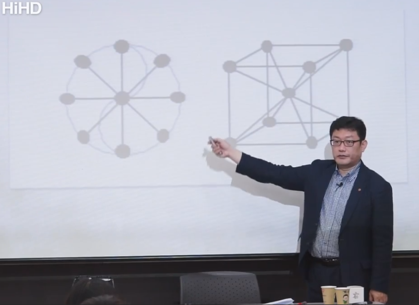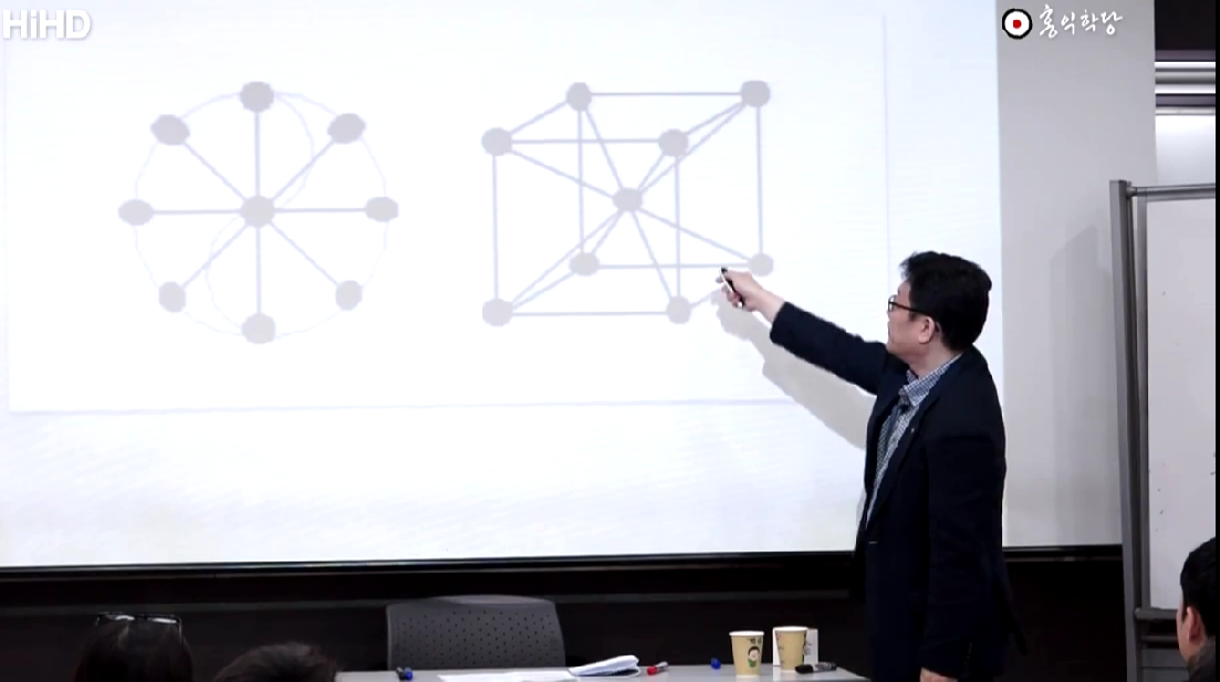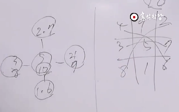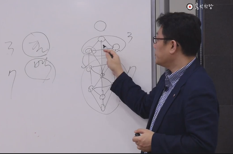 아무튼 아까 제가 6789 했는데 보세요. 6은 집이고 7은 땅을 뚫고 올라오는 싹이고 8은 분열이고 9는 손이 변화한 모습입니다. 이게 이 6이 나중에 지금 이 모양(六)으로 변했죠. 7, 더 싹이 나는 모양(七)으로 더 변했어요. 8(八). 9(九)는 이렇게 썼죠. 이것도 보시고. 9는 이제 마지막 통합입니다. 그래서 9가 끝이에요. 그래서 어디나 9단 까지 있고 9단이 입신의 경지입니다. 바둑에서 9단이 입신이에요. 이제 신인의 경지에요. 10단은 얘기 안 해요. 왜냐하면 10이라는 거는 완성이고 끝이기 때문에. 그래서 9 까지가 제일 신통한 거예요. 끝없는 변화를 부리고 있는 게 9예요. 오늘은 오늘의 최선. 그게 9예요. 9단. 바둑, 진정한 바둑 9단이라면 오늘은 오늘의 최선, 내일은 내일의 최선에서 계속해서 최고의 변화를 자기가 할 수 있는 역량의 최선을 끝없이 추구해 가는 경지가 9예요. 그 중에 제일 앞에 있는 사람이 있겠죠. 그 사람을 명예로 10단이라고 부를 수는 있지만, 그래서 제가 화엄경 강의 할 때 10지보살은 실제론 9지보살이에요. 9지보살중에 제일 어른을 10지보살 하는겁니다. 제일 고수. 9지 안에도 또 레벨이 차이가 있을 것 아닙니까? 그 중에 해보면 제일 센 사람 있겠죠. 그 사람을 10단 주고 부르는 겁니다. 그래서 이 화엄경 철학까지도 결국은 1부터 10이란 숫자를 알면요 다 알 수 있어요. 언제쯤 되면 사람이 좀 볼만 하겠습니까. 6지보살까지는 뭐 닦겠어요? 6바라밀을 하나씩 닦는다는 게 뭘까요? 하나의 씨알. 견성한 건 1이구요. 1이 전후좌우상하를 갖춘다는 건 보시 지계 인욕 정진 선정 지혜로 여섯 개의 아이템을 얻어서 이제 여섯 개의 아이템을 얻었다는 게 6지 보살인데 아직 구실을 못 해요. 6지 보살은. 가운데 중심 찍어야 방편바라밀이라고 여섯 개 아이템을 마음대로 쓸 수 있는 바라밀이 방편바라밀입니다. 중심 잡아야 7지보살입니다. 7지부터 여러분 성인소리 듣습니다. 화엄경 7지 조에 보면은 이제 번뇌를 벗어났다. 아주 자유로우려면 8지는 가야된다. 8방으로 자유자재 해야 아주 자유롭다. 9지는 갈 데 까지 갔죠. 9지보살이면 사실 끝이에요. 거기서 10지라는 건 9지 중에 제일 꼭대기를 10지. 그러니까 10지도 결국 9지인 이유가 화엄경의 10지에서 결국 10지는 끝이라고 해야 되는데 이미 부처다 라고 해놓고 아직도 갈 길이 멀다 하고 끝내요. 그러니까 이게 화엄경 쓴 사람은 정확히 알고 있는 겁니다. 유대교의 세피로트랑 화엄경의 10지랑 우리의 천부경 철학이랑. 중국 철학은 당연히 천부경 철학이 가서 나온 겁니다. 천부경이 갔다고 하면 안 되고 천부경에 담긴 그런 수리철학이요 홍산문화에서 중원에 전해져가지고 중원에서 부풀어진거기 때문에 똑같에요. 철학이. 이렇게 따지면 인류가 지금 연구하고 있는 가장 고급수. 연구한 지금까지 알아낸 로고스 중에 과학자들이 알아낸 로고스는 정말 현상계적인 로고스구요 정말 심오한 무형의 세계까지 관장하는 로고스 파들어 간 것 중에 제일 극치에 가서는 다 만나고 있다는 것도(잘 못 들음). 이런 것도 연구 해 보셔야 돼요. 저는 뭐 종교가가 아니기 땜에 신앙의 대상을 얘기하는 게 아닙니다. 연구하면 알아낼 수 있는 그걸 말씀. (잘 못 들음)안에서 계속해서 연구해 보세요. 1부터 10이 어떻게 내 생활을 지배하고 있는지 보시면, 신기하게 제가 학당을 운영해도요 저는 학당 운영이나 수련에 보면 7년 정도 됐을 때 딱 자립이 돼요. 신기하죠. 7년 정도 학당을 운영하니까, 7년 운영하고 제가 유튜브에 공개할 힘이 생겼어요. 신기하죠. 왜 그 기간 됐을 때 전 까지는 안돼요. 전후좌우상하를 갖추느라고. 일곱 살이 되면 왜 아이가 자립, 에고가 극성해지죠. 일곱 살 아이들은 상대하지 않는 게…. 에고가 자립을 해요. 에고가 자립을 해서요 이제 동등한 대접을 원합니다. 내가 왜 이런 대접을 받아야 되는지 불만을 품어요. 예전에 일곱 살이면 학교도 가고 그랬잖아요. 전 일곱 살 때 학교 갔어요. 여덟살은 가야 안정적으로 학교생활 할 수 있죠. 이거 신기하죠. 8은 돼야 자유롭고 7은 돼야 사실 가능해요. 7부터는 자립이 되기 때문에. 천지분간을 한단 말이에요. 7이 되면. 자아가 이제 주인공 노릇을 하려고 그래요. 신기하죠. 여섯 살 까지는 그게 안 되는데. 왜 일곱이 되면은 고 자립이 되냐는 거죠. 이 수리 질서에서 우리가 벗어날 수 없다는 거. 이런 측면에서 로고스라고 하는 거예요. 우리가 벗어날 수 없으니까 연구를 하는 거죠. 9는요, 입체물의 여덟 귀퉁이는 결국은 이 8방의 중심점이라는 측면에선 지금 9라는 수가 나오죠. 즉 홍범구주라는 거는 8방의 중심인 황극에 대한 얘기를 해 놓은 겁니다. 그래서 결국은 홍범구주도 간단한 이 그림으로 설명이 된다고요. 결국 이 그림을 설명해 놓은 겁니다. 홍범구주라는 건. 그래서 중용에서 천하 경영에는 아홉 가지 대법이 있다고 그래서 또 똑같이 가운데 임금 자리를 놓고 아홉 개로 돌려요. 정치 덕목들을 8방으로 돌려요.