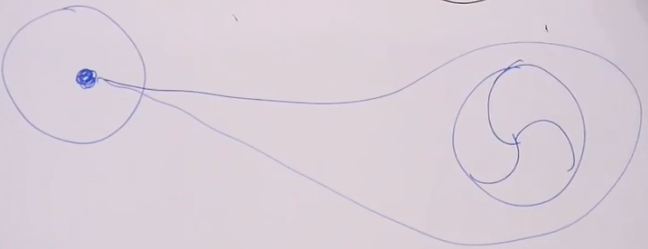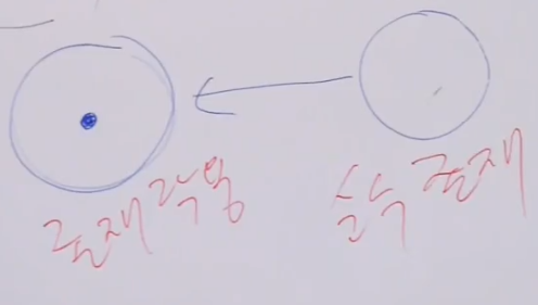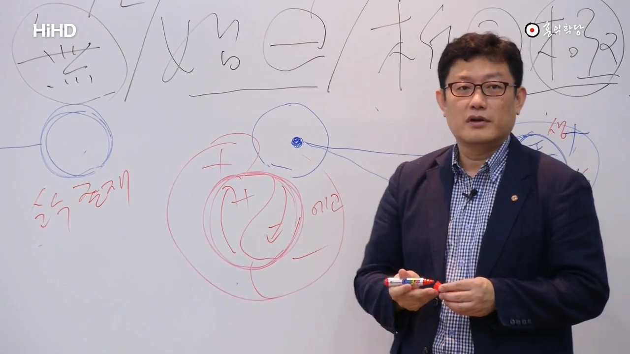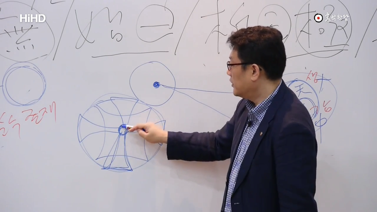 즉 구멍이, 양 쪽으로 구멍이 뚫린 터널을 말해요. 터널 중간이 비었다 해서 공이라는 말이 나온 거예요. 이해되시죠. 여러분 차 타고 가다 터널 지나죠. 그 터널이란 공간이 원래 산이 있어야 되는데 비어있죠. 비었다 해서 空. 여기랑 저기랑 통한다(工). 여기랑 저기랑 통한단 뜻이에요. 요놈은(工). 앞에다 삼수하면요(江). 다리 놓을 수 있는 그 물을 예전에 강 그랬습니다. 기술이 좋아지면 다리를 바다도 건너고 하니까 이걸로는 설명이 다 안 되겠지만 예전에는 다리를 놓을 만한 그 강을, 하천을 강 그랬죠. 그래서 空과 無가 결국은 비었다. 라는 뜻인데, 보세요. 천지만물의 씨알이 되는 하나. 이걸 그림으로 그려 볼게요. 하나라는 거는 우주의 근원이라는 뜻이고 요 그림을 그려보면(☉). 無는 텅 비었다는 뜻입니다(○). 원불교 일원상이 이거죠. 무극. 텅 비었다. 거기서 하나가 나왔고 그 시작된 하나(☉)가 셋으로 쪼개졌다. 무슨 말인지 아세요? 요거(☉의 중심점)를 확대해 보면 요 안에가 삼태극으로 돼있더라는 겁니다.