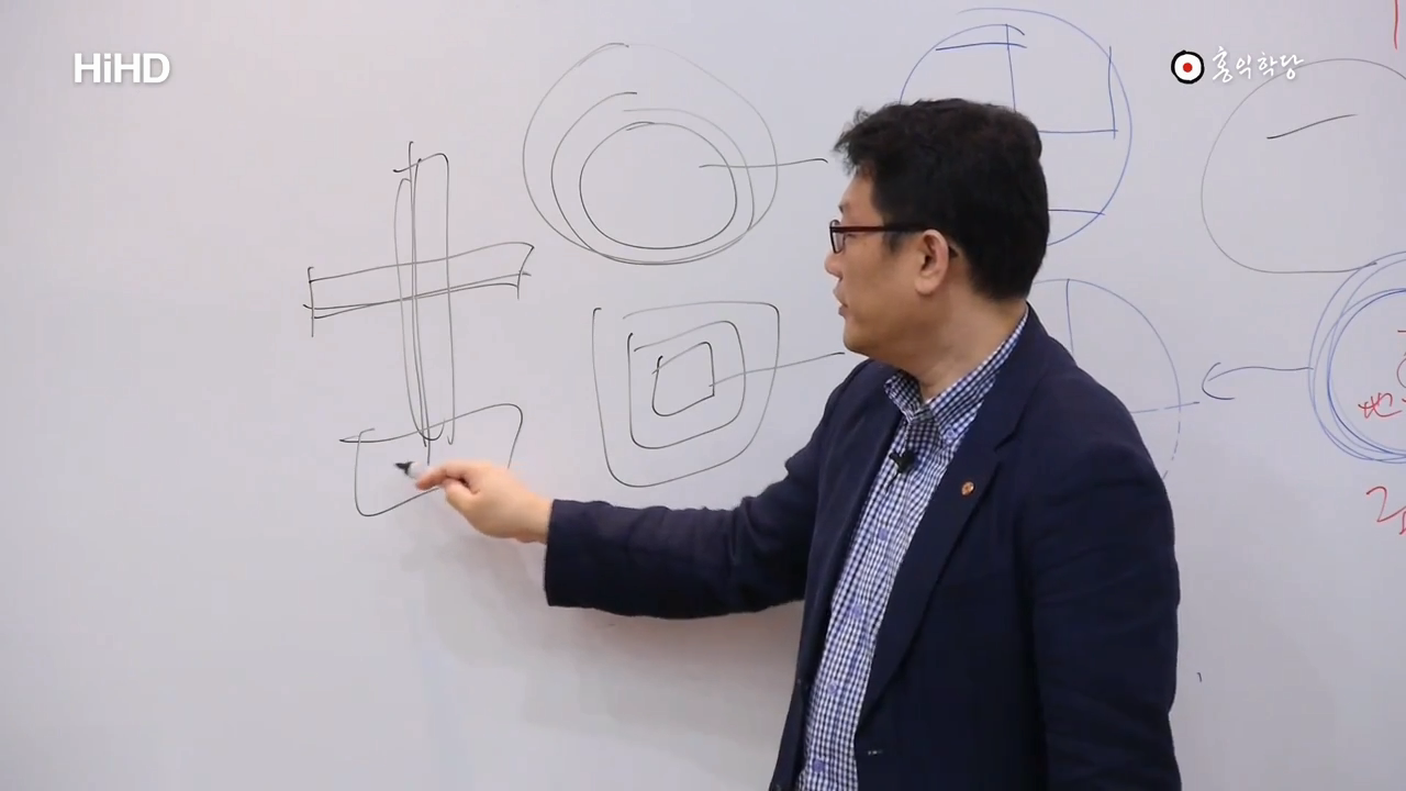머리를 밑으로 한 게 식물(▽). 동물들 곤충들(▷◁). 지금 우주 살아가는 천지만물도 그려져 있고 알을 중심으로 우리가 이 세계에서 무로 돌아갈 게 아니라 인의예지라는 오행을 잘 표현해야겠다. 그리고 여기까지(뾰족한 네모 모서리) 끝에(원주) 닿게 해서 八正道도 표현한 거예요. 팔방으로 잘 경영을 해야겠다. 이 제가 연구해서 만든 겁니다. 디자인은 또 멋진 디자인을 나중에 만들겠지만 기본 이런 그림을 가지고 우리가 우리 철학을 표현하고 싶어서 한 거예요.