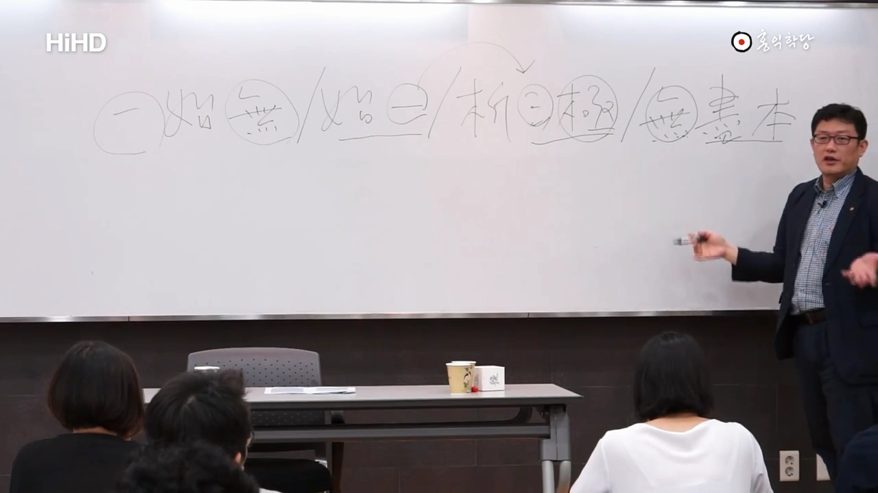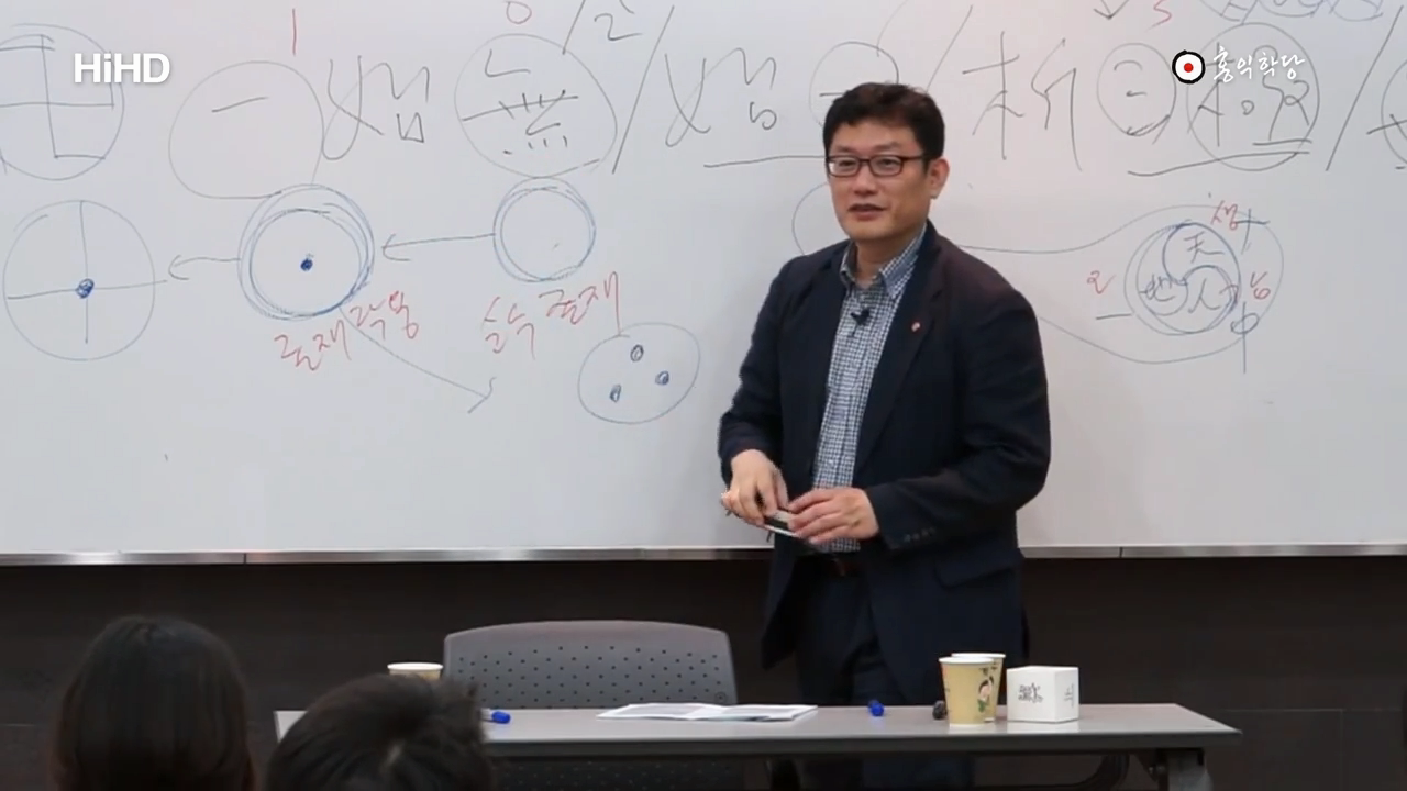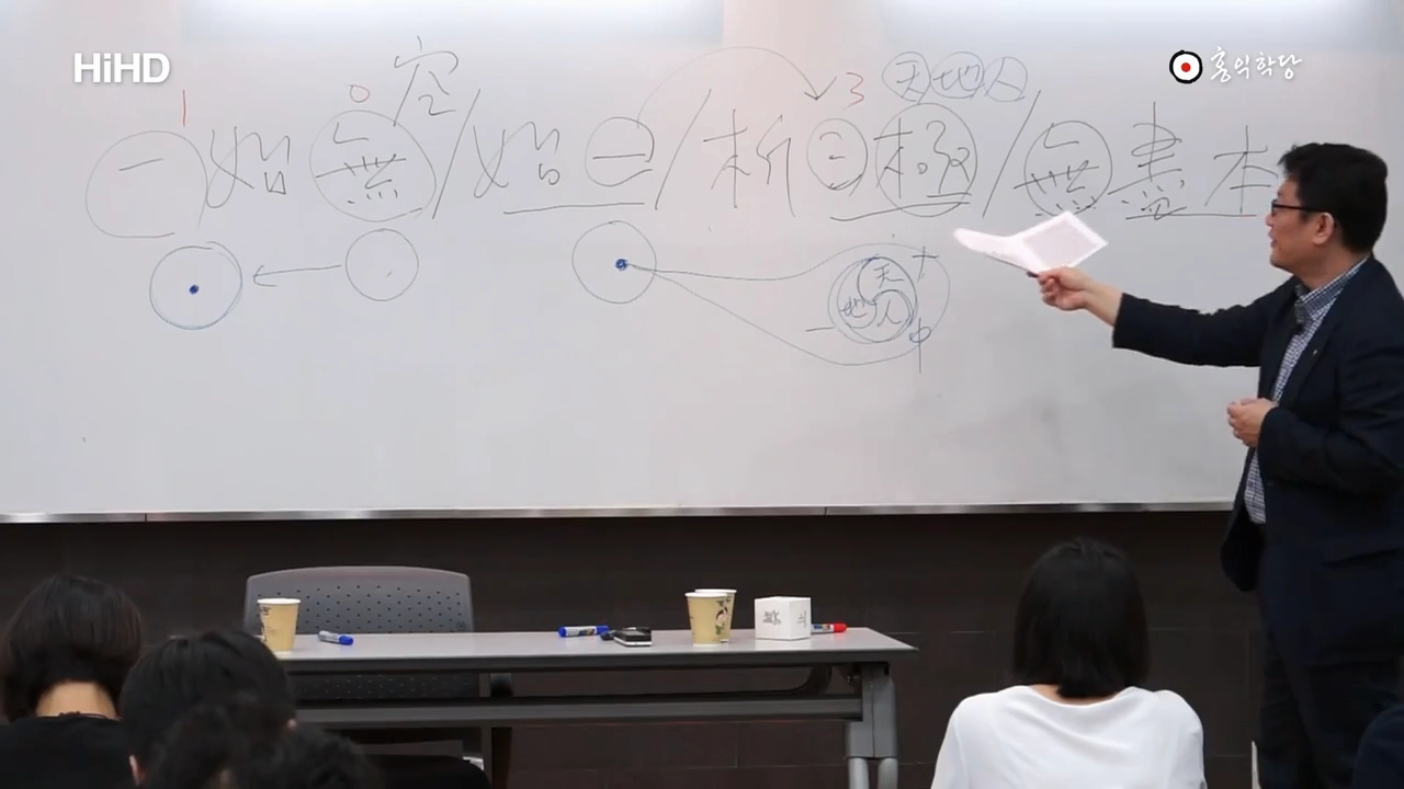 그런데 그 자리가 내 생각 내 감정 오감을 경영한다. 올바른 방향으로, 양심적으로. 그럼 황극이 됩니다. 쉽죠. 그래서 여러분 마음속에서 찾으셔야 돼요. 요게 지금 우주의 스토리라고만 아시면 안 돼요. 여러분도 소우주기 땜에 이대로 굴러갑니다. 여러분 마음의 본질이 결국은 텅 빈 데서 나왔다. 空寂한 데서 여러분 마음의 중심이 나왔고 여러분 마음의 중심. 요놈이 양심이죠. 양심의 본은 텅 비어 있는데 그 놈이 이제 양심으로 또렷이 기능할 때 거기서, (태극 그림에서 중심점이 삼태극으로 확대되는 그림)天地人 대신에 뭐가 들어가면 되겠습니까? 여러분은. 하늘이 생각이고 인간이 감정이고 땅이 오감이에요. 생각 감정 오감의 씨알이 그 안에 다 들어있더라. 그래서 밖으로 펼쳐져서 여러분 마음이 一切唯心造가 돼서 여러분 마음이 돌아가는데 결국은 텅 빈 空이 근본이더라. 요렇게 풀어도 되겠죠. 여러분의 마음을 가지고 우리가 이걸 읽어내면요. 그럼 이게요 모든 불경의 핵심 아닙니까. 지금 방금 말씀드린 이 한 구절이. 반야심경보다 훨씬 지금 설명이 더 잘 들어간 거예요. 종합적으로. 이해되세요? 空에서, 色卽是空 이렇게 하고 넘어가는 게 아니라 空에서 하나가 나왔는데 그 하나가 셋으로 쪼개져서 三界를 굴리는데, 이게 삼계라고 해도 되겠죠. 삼계를 만들어내는데 생각감정오감이 삼계의 본질입니다. 이게 세 가지 차원대의 우주가 펼쳐지면서 여러분이 그 안에서 살아가는데 결국은 텅 빈 공이 근본이다. 이해되시죠. 자 여기까지는 동서양에서 철학 좀 했다 하면 다 도달해요. 여기까지. 그런데 여기서 많이 패가 갈려요. 어떻게 갈리느냐? 그러니까 빨리 다시 공으로 기어들어가자는 派가 있습니다. 해탈, 열반파. 이 상태에서 최선을 다해 생각 감정 오감을 경영하자는 파가 있어요. 대승파. 소승과 대승이 이거는 공유하는데 또 갈라져요. 이해되세요? 공유하면서도 기본 입장이 달라요. 왜 기어 나와 가지고 이 고생을 했을까 無에 있었으면 최곤데. 요게 힌두굡니다. 힌두교와 소승불교는 이 사상이에요. 여기서 이 지상에 떨어진 것부터가 잘못됐다. 그래서 이 떨어지게 한 존재를 힌두교는 마야라고 부르고 싫어하고 불교는 무명이라고 하면서 싫어합니다. 나를 이 세계로 내던진 그 힘. 그것만 내가 벗어나면 다시 요 세계에 들어가서 쉴 수 있다. 이게 소승 철학이에요. 대승 철학은 마야가 우리를 던진 게 아니라 참나의 작용으로 우리가 나타났다고 봅니다. 자 여기서 이 천부경의 논리대로 생각 감정 오감이나 天地人이 안 나타날 수가 있나요? 우주에. 없죠. 우주의 필연적인 그 수의 로고스. 우주가 갖고 있는 만물의 로고스가 자연스럽게 발현되는 모습입니다. 무명이 만든 게 아니에요. 마야가 만든 게 아니란 말이에요. 신이 만든 거고 우주의 순수 존재가 자신의 존재를 현상계 안에 시공간 안에 멋지게 드러낸 거죠. 이렇게 보면 전혀 다른 철학이 나와버려요. 기어 들어가는 게 이제 목적이 아니고 어떻게 멋지게 신의 공의 그 본질을 내가 현상계에서 표현할까가 문제가 돼요. 이해되시죠. 전혀 다른 철학입니다. 소승과 대승은 그냥 다른 종교예요. 완전히 다른 종교라고 아시면 돼요. 두 개가 만날 지점이, 그러니까 기본적인 토대는 비슷한데 그거는 모든 철학이 공유하는 토대고요 거기서 조금만 나가면 완전히 달라져요. 전혀 다른 꽃으로 피어납니다. 그래서 천부경을 대승철학입니다. 空으로 돌아가자는 얘기가 안 나와요. 그래서 지금 미리 말씀을 드리는 거예요. 이 구절만 이해해도 재밌겠죠. 요 박스까지 이해하면 더 재밌습니다. 보세요. 텅 빔에서 하나가 나왔다는 거는, 텅 빔이 존재 자체고 하나는 존재의 작용이라는 거죠. 자 태극과 황극 즉 우주의 씨알과 우주의 경영자라는 것은요 존재의 작용이나 생명의 나타냄일 뿐이다. 본래 둘이 아니다. 무극이 존재의 바다라면. 자, 아까도 했던 얘긴데 보세요. 존재의 바다에서 바다의 미묘한 움직임이 태극이라면 황극은 바다의 파도다. 이제 황극까지 집어넣으면 황극이야말로 진정한 파도다. 존재의 작용은 파도의 어떤 기점이죠. 파도의 근원. 자 보세요. 황극은 이렇게 표현됩니다. 예. 이거 보시면 되게 웃기지 않으세요? 여러분 생각해보시면 되게 웃긴 겁니다. 보세요. 원불굔 이거(◯) 그려놓고 신앙하죠. 불교는요. 이걸(☉) 그리는 게 아니라 삼태극을 그리죠. 이거의 변형이에요(동그라미 안에 점 세 개). 삼태극이. 점 세 개 찍어놓고 불교는 신앙합니다. 그렇죠. 카톨릭은요 요거(⊕) 십자가 그려놓고. 거기 쓰는 로고죠. 또 불교는요 팔정도랑 오행을 섞은 버전이죠. 卍자 그려놓고 또. 한 종교도 아니고 뭐 이렇게. 학당은 이거(☉) 그려놓고 있죠. 웃기죠 서로. 서로 웃기지 않을까요. 알고 보면. 아 저기서 이거 썼네. 난 이거 써야지. 하고. 이미 이거죠. 서로 모순된 거 같지만 하나란 얘기 아니에요? 서로 하나니까 지금, 비슷비슷해요 다 그게 그거죠.