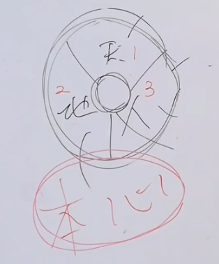 거기에 세피로트가요 요게 무극이거든요. 아인 소프라고 써있죠. 요게요 지금 그 무슨 소리냐면 아인이 無라는 거고 소프가 어떤 정해진 겁니다. 제약. 어떤 제약도 없는 존재라고 우주의 근원을 설정해요. 무극이죠. 거기서 이게 태극이에요. 그 다음 게. 요게 태극을 상징해요. 하나의 씨알이 나오는데 요 씨알을 가지고 이제 풀어내 봅니다. 그래서 요 놈이 결국은 태극인데 태극 안에 또 세 개가 쪼개져 있더라. 세 개가 들어 있더라는 겁니다. 삼태극이 됐죠(위에 있는 위로 솟은 삼각형). 자 요게 하늘을 먹습니다. 하늘. 왜 그럴까요? 아까 제가 지워버렸는데 아까 어떻게 됐었죠? 간단하게만 그려보면 여긴 사람이고 하늘이고 땅이었으면(無를 天地人이 둘러싼 그림) 자, 이 전체가 태극이죠. 이게(가운데) 무극이라면 요 전체가(天地人까지) 태극이죠. 이건 절대계의 에너집니다. 그러면 이 태극 자체가 태극 안에 또 천지인의 씨알이 있었죠. 그런데 태극 자체가 사실은 하느님 아닌가요? 여기서 아직 지금 인간도 안 나왔고 땅도 안 나온 상태잖아요. 그러다 보니까 이 세피로트는 이겁니다. 이 자체가 사실은 하늘을 대표해요. 하늘 안에 이미 또 세 개의 음과 양과 중간이 찢어져 있다. 그런데 하늘이니까 위로 삼각형을 뽑습니다. 그러면 당연히 밑에는 아래로 삼각형을 뽑겠죠. 여기에도 또. 그러면 이거는 중간이니까 사람에 해당됩니다. 두 개의 음양과 가운데 中. 이쪽이(보는 사람 입장에서 오른쪽) 양입니다. 양과 음과 가운데 중. 이건 땅이겠죠. 이것의 완성(땅의 삼각형 밑의 원) 해서 세피로트는요 이렇게 연결해 놓고 지금 이렇게 하고 이렇게 뽑고 그쵸 이렇게 연결하고 이러면 세피로트가 되죠. 아 여기까지 연결 짓고. 이 핵심이 아래로 향하는 삼각형 두 개와 위로 향하는 삼각형 하난데 이게 천인진데 사람으로 치면요 머리와, 머리 가슴 밴데 이게 사람 상징하고 이게 땅을 상징하고 머리가 하늘 상징하니까 머리는 위로, 몸뚱이는 이미 다 땅이거든요. 사람이건 땅이건 다 땅입니다.