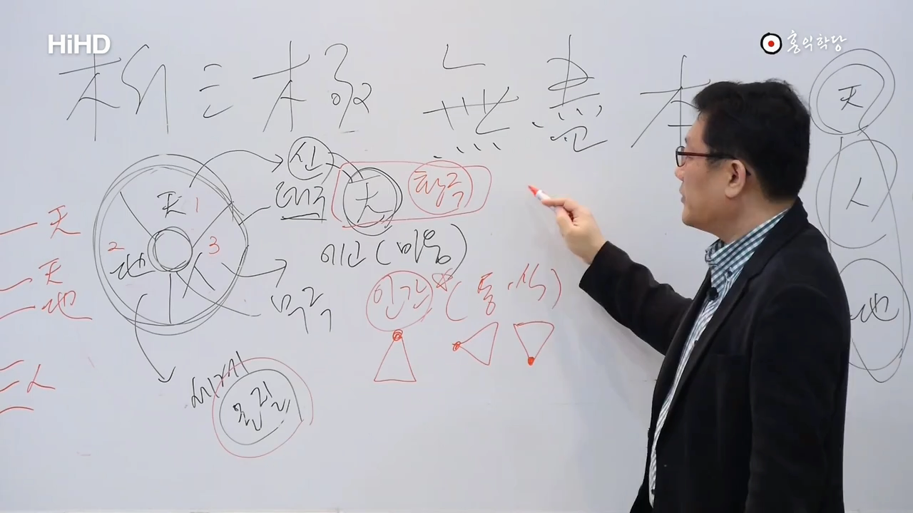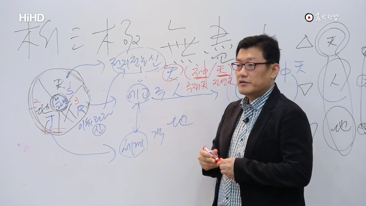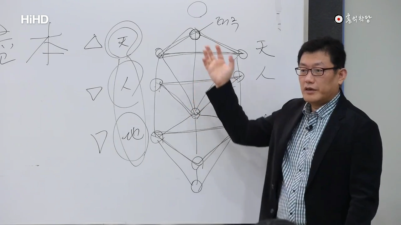 하나가 우주의 태극인데 삼태극을 말하는 거예요. 삼태극 중에 하늘의 하나는 첫 번째요 땅의 하나는 두 번째요 사람의 하나는 세 번째라는 건요 삼태극 안에 이미 있는 똑같은 하난데 그 하나가 셋으로 쪼개졌을 뿐이지 똑같은 하나죠. 근데 굳이 넘버를 매기면 하늘이 1이요 땅이 2요 사람이 세 번째다. 왜냐면 사람이라는 존재를 설명하려면 하늘과 땅이 전제돼야 되니까요. 무형이 유형보다 앞서니까 하늘이 먼저고요. 자 이렇게 이런 순서를 갖고 있다 뿐이지 이 셋간은요 사실 위상은 동일하죠. 굳이 이제 서열을 정해 볼 뿐이지 이 자체는 다 태극 안에 있는 세 가지 에너지를 말합니다. 그래서 이 에너지가 그대로 사실은 하느님이 돼요. 태극이 그대로 하느님이 돼요. 그리고 보세요. 태극의 이 신성한 영역이 주가 돼서 하느님이 나타나고 태극의 에너지 중에 이제 사람을 이룰 씨앗이 장차 커져서 인간을 만들고 동물을 만들고 식물을 만들고. 땅을 이루는 태극의 요소가 이건(태극) 어차피 절대계니까 현상계에 펼쳐지면 물질이 만들어 진다. 현상계에서는 물질이 되고 자 근데 재밌는 게 현상계는 물질이 되고 인간이 되는데 요거(天)는 그냥 신이니까 이 현상계 안에서 하늘 역할을 하는 게 뭐가 되죠? 공기요. 공기의 하늘이 또 나옵니다. 그래서 지금 우리가 흔히 하늘, 무형의 하늘 유형의 땅 중간의 사람 그러는데 그렇게 분석하면요 이렇게 돼요. 요 이거 이 요소(몸)는 땅이고 내 안에 호흡이 들어와 있는 게 하늘이 되고, 지금 영혼의 문제가 설명이 안 되죠. 예. 그래서 인간은 그 중간에 희노애락을 느끼는 존재가 인간인데 하늘엔 없던 그냥 그런 인간의 그 감정이 이제 중간에 인간에서 설명되고 말 뿐인데 이렇게만 설명하면 하늘이 뭔가 빈약해져요. 하늘에 대한 설명이.