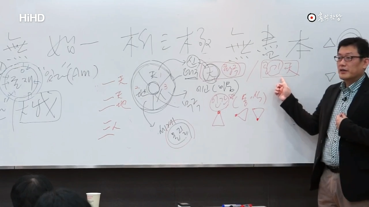 여기까진 아직 하늘나라 얘깁니다. 절대계 얘기예요. 그래서 현상계에도 하늘 생기고 이런 공기의 하늘 땅 그리고 중간에 사람 생겼다고 말 할 수도 있고, 공기의 하늘도 땅적인 거니까 사실 공기도 분석하면 다 어떤 입자가 나오잖아요. 고거 말고 땅 사람 그리고 하느님. 이 우주를 경영하는 하느님이, 천지인의 요소의 천은 하느님이다. 라고 말 할 수도 있다는 거. 우리가 너무 천지인 할 때 천을 무형의 우주로만 자꾸 생각하시는데 예전 어른들은 그 감각에 하느님도 들어있단 말이에요. 하느님 혹은 무형의 우주. 이렇게 해서 天의 요소를 잡았고 땅의 요소는 덩어리 있는 물질. 사람의 요소는 이 뭐죠 몸뚱이랑 영혼을 다 갖고 있는 존재. 이렇게 해서 우주의 세 존재를 구성.