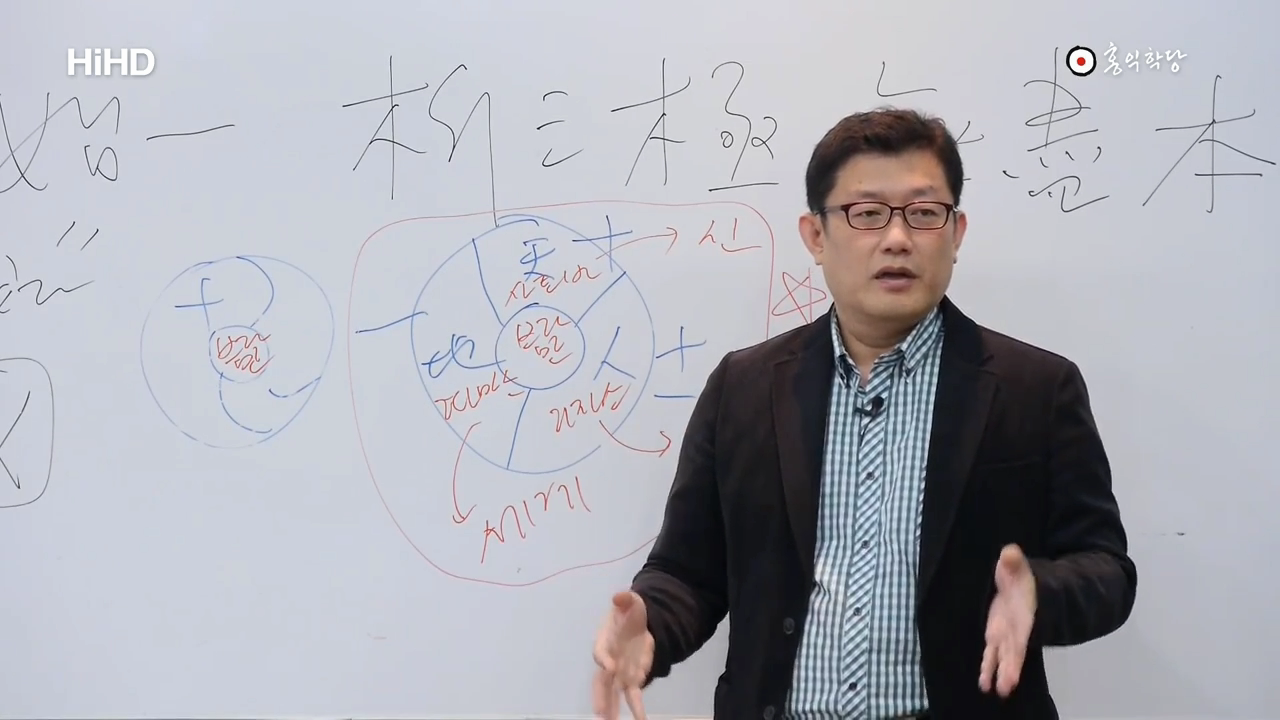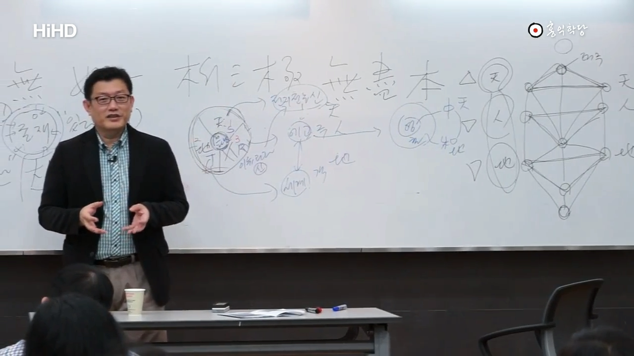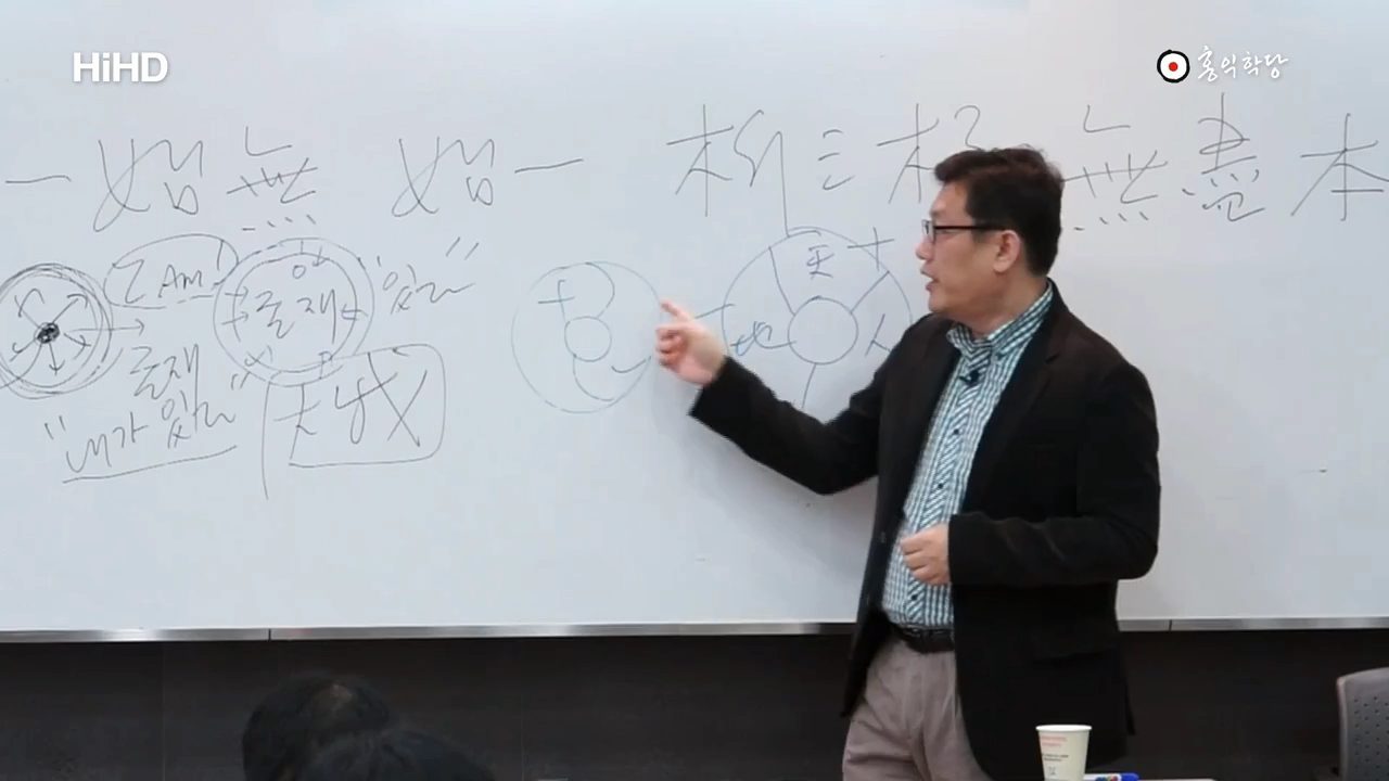 인간이 천지, 천지의 이 신묘한 결합체다. 할 때는 영혼의 문제도 설명이 돼야 되는데 갑자기 나타난 이 희노애락의 문제가 설명이 안 돼요. 희노애락은 대개(?) 땅적인 요소고. 희노애락 이전에 신성한 인간의 마음이 하늘이다 이렇게 하면은 뭐냐면은 이 하늘한테 신성한 의미까지 부여하면요 하늘과 땅의 결합이라고 할 때 영혼과 물질의 결합으로 인간을 설명할 수도 있잖아요. 그러니까 요 하늘에서 영혼적인 신적인 요소를 빼고 우리가 그냥 우리를 둘러싸고 있는 대기의 하늘을 가지고 하늘, 땅, 인간은 천지의 결합 그래버리면 그냥 물질에 공기 들어있다는 거 밖에 설명이 안 되잖아요. 갑자기 나타난 희노애락은 뭐냐는 거죠. 근데 희노애락도 가만히 들여다 보면 요놈도 무형이니까 꼭 하늘같지만 물질처럼 작용하는 희노애락의 요소들은 결국 땅의 요소니까 결국 이렇게 보면은 하늘을 이 우리의 신성한 그 靈의 세계로 보고 물질을 육체로 보면 이 두 개가 만나서 중간에서 땅을 닮아서 희노애락이 일어나고 하늘을 닮아서 우리 안에 있는 신성한 어떤 영을 갖고 있다. 이 삼태극 하나를 놓고도요 많은 얘기를 할 수 있는데 간명하게 이렇게만 볼게요. 무에서 하나가 시작됐는데 이게 우리의 본질이다. 라고만 생각을 해 주시면 좋겠습니다. 요게 여러분의, 천부경식 표현으로 여러분의 본심입니다.
