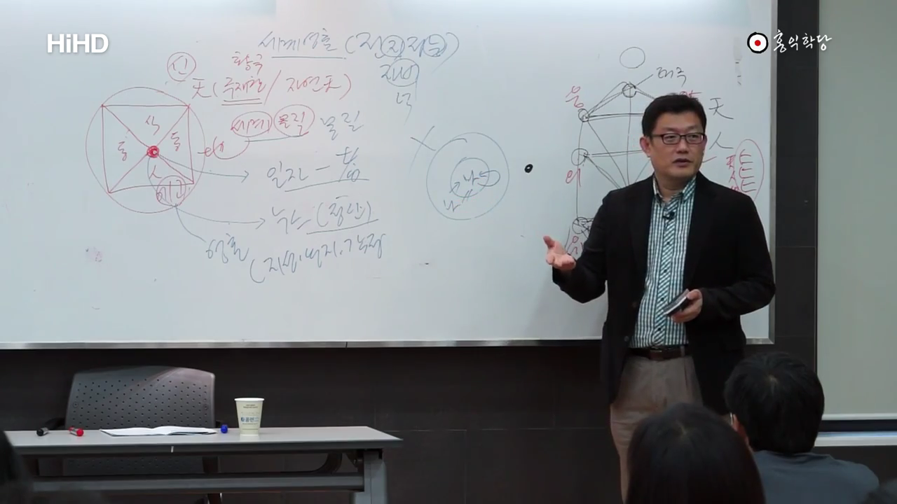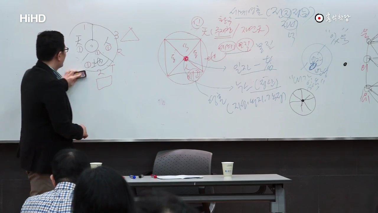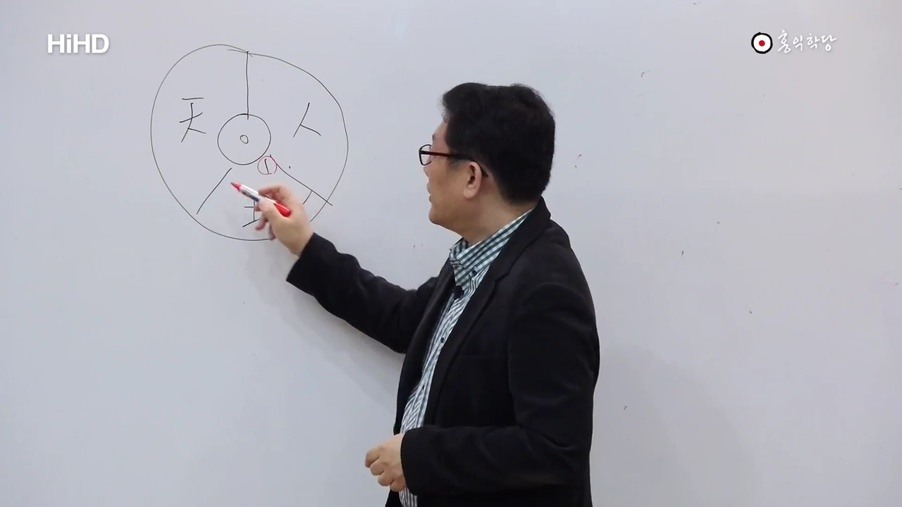 이게 지금 결국 그래서 이 동등한 위상 동등한 자격이긴 한데, 그 안에서 또 굳이 位相을 조금 나눠보자면 하나 둘 셋이 또 쪼개진다. 자 하늘이 무형이 먼저요, 유형이 두 번째고, 유형과 무형이 합쳐진 사람은 세 번째다. 하지만 결국은 하나란 점에선 사실 동등하다. 고걸 뭐라고 말씀, 밑에 있나요. 天一一 地一二 人一三. 이렇게 말 한 거를, 하늘의 씨알이 되는, 하늘은 동그라미로 상징하죠. 하늘의 씨알이 되는 하나가 첫째고. 땅의, 네모난 땅의 씨알이 되는 하나가 두 번째고. 세모난, 세모인 사람의, 지금 이 만물의 대표라는 건 동물 식물도 요 세모에 들어가니까 그래요. 예. 대표가 되는 하나는 세 번째가 된다. 이것이 동등한 자격을 지닌 셋 사이에 존재하는 위상이다. 또 조금씩 차이가 있긴 하다. 요게 이제, 하나의 씨알이 요게 지금 숫자로 말 하면 뭘까요. 1이죠. 요 1이, 제가 가운데 비워놓을게요. 0을 넣어 놀게요. 가운데 비어있습니다. 0이 1로 작용하는데 여기에서 뭐가 나오느냐. 하늘이 나옵니다. 천. 요 하늘은 主宰天이라고 하는 하느님일 수도 있고, 하늘을 경영해야 하니까요. 현상계 안에 실제 많은 작용을 일으키기 때문에, 작용하는 건 안 보이지만, 무위의 작용을 해서 현상계에 춘하추동이 오게 만들고 만물이 팽창하고 수렴되게 만들고 다 하고 있잖아요. 실제적인 힘을 쓰고 있기 때문에 하늘도 현상계 안에서 그 작용하는 어떤 힘들을 설명할 때 하늘도 반드시 설명을 해야 되는 겁니다. 분명히 다르지만. 그리고 자연천, 자연의 하늘도 있어요.