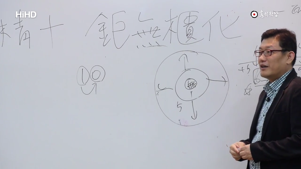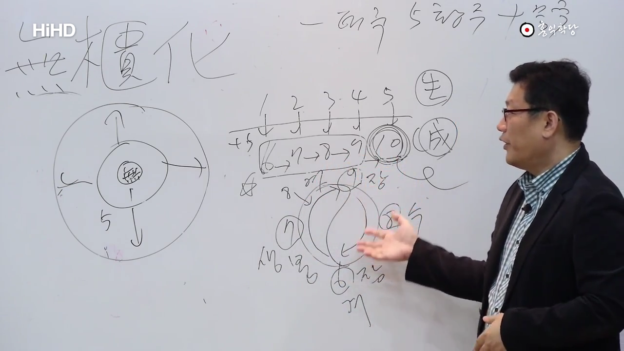 근데 오늘이 완성이냐. 오늘 밤에 연습 좀 더했더니 내일 좀 더 다가간단 말이에요. 이 무상한 현상계에서 완성이라는 건 있을 수 없기 때문에. 10은 그대로 0이랑 통합니다. 이건 무극이에요. 이거는 완벽한, 이 완벽한 완성이라는 거는 우주의 정지고 그건 없는 거기 때문에 현실에 없는 거기 때문에 이건 무극의 세계라고 이 봅니다. 그래서 동양에서 예전에 그 정역 쓰신 김일부선생같은 경우 一太極 五皇極 그 다음 무극을 뭐로 했을까요? 十無極. 10을 무극으로 봐요. 즉 10은 0으로 보는 겁니다. 그러니까 현상계의 수로 보지 않아요. 하지만 10이라는 게 반드시 필요해요. 거기가 우리가 향해 가야 할 목표기 때문에. 그런데 완벽해진다는 건 더 이상 한 걸음도 나아갈 수 없다는 거죠. 그럼 현상계에 존재할 수가 없습니다. 완벽한 완성은 현상계에 없어요. 그거는 무극, 무의 세계지 그건 현상계엔 없다. 요렇게. 이해되시죠. 그래서 결국 하나가 쌓여서 열이 됩니다마는, 결국 이 모든 거는요 보세요. 텅 빈 무에서 예, 1이 나오고 그 1에서 우주가 다 나왔어요. 1에서. 이렇게 1이 우주를 경영할 때 5란 숫자가 나오죠. 동서남북의 중심이니까. 이렇게 경영하고 있는데 결국은 그, 그래서 이 현상계에서 이 10까지 다 갖춰진다고 하더라도 하나에서 5가 나오고 입체가 되고 이렇게 하다가 10이 된다고 하더라도, 입체가 나오고 또 뭐가 나오죠? 앞에 전후좌우가 돼서 상하가 돼서 팔방이 되고 9가 돼서 완벽해지면 10이 되는데 그 모든 게 결국은 無를 다음어서(鉅) 상자화(櫃化) 한 거다. 무를 다듬어서 빚어낸 거예요. 다. 모든 변화는 무를 빚어서 만들어 낸 거다.