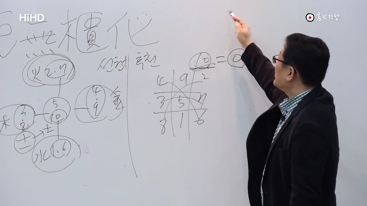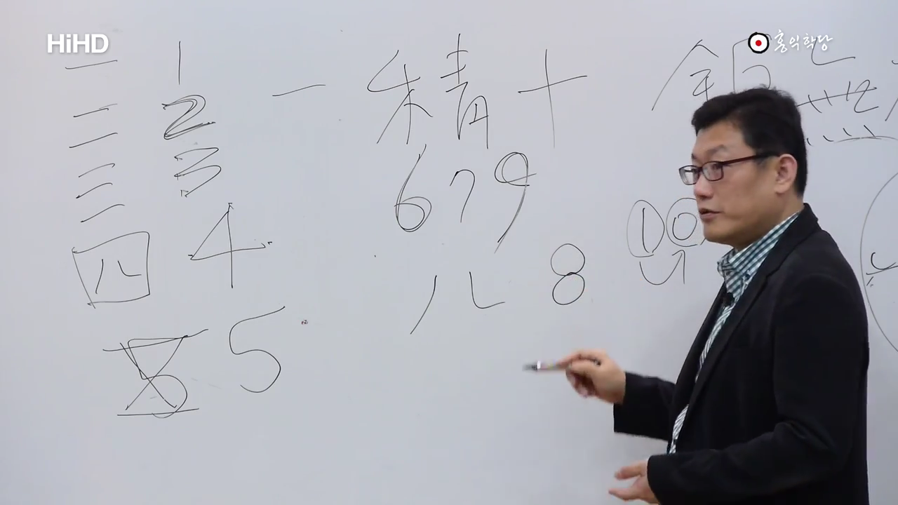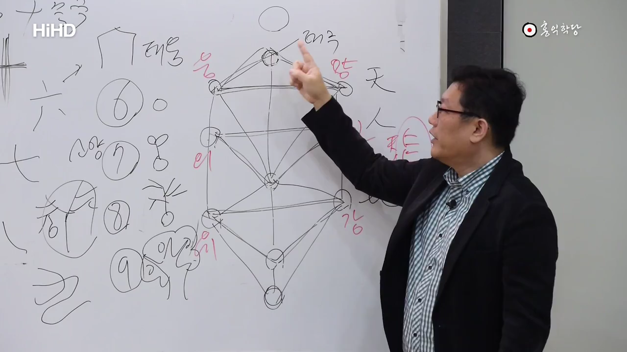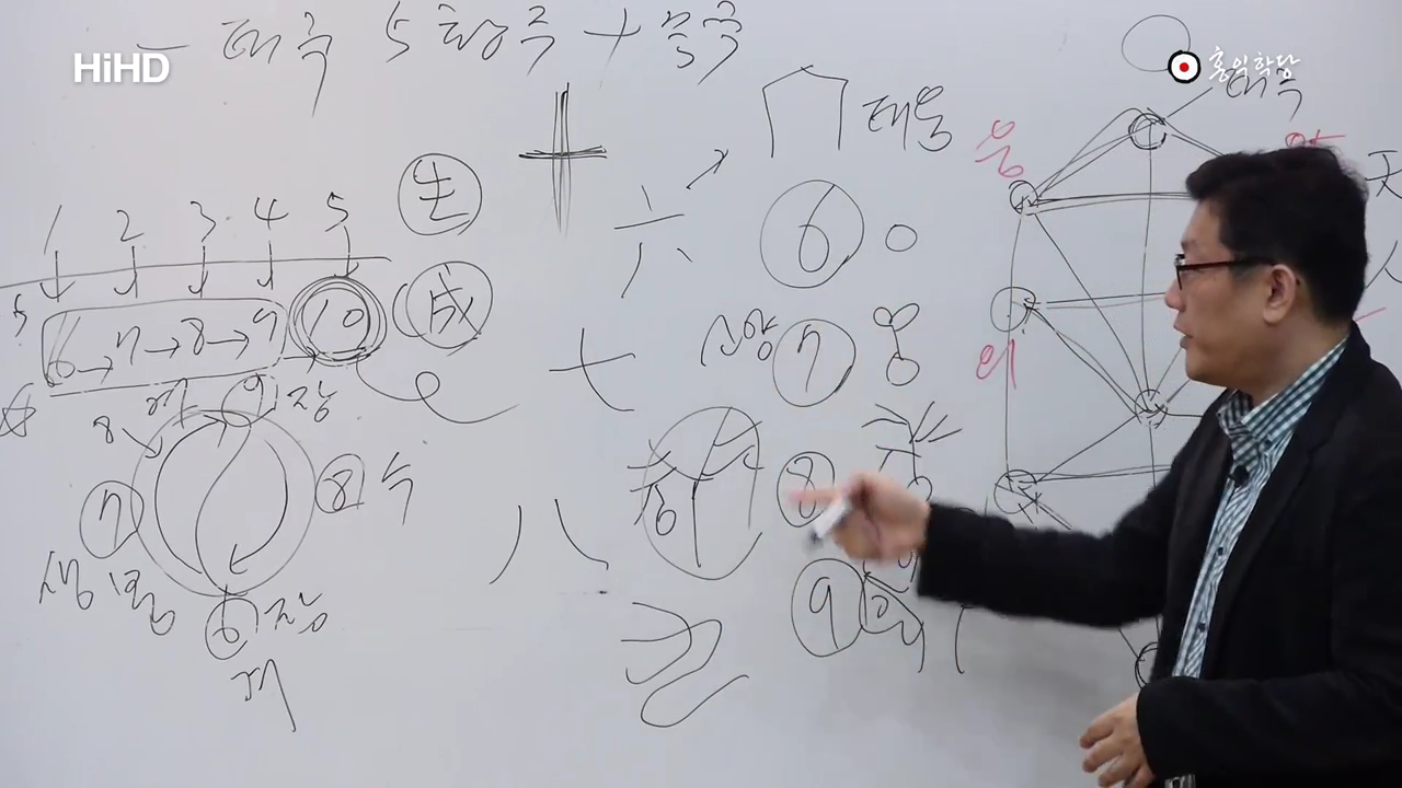 三天二 三地二 三人二 그건 다음에 할까요? 여기 이제 다음에 할 텐데요 미리 예고만 할게요. 하늘도 셋이 있죠. 땅도 셋이 있죠. 사람도 셋이 있죠. 그 중에 둘씩 둘씩만 취하며는요 숫자가 뭐가 나오죠? 6이란 숫자가 나와요. 근데 6이란 숫자는요 6 7 8 9 지금 요 얘기만 좀 더 하고 제가 끝내면요, 앞으로 장차 이제 6 7 8 9 얘기를 많이 할 텐데 6은요 겨울이니까 씨알 상태예요. 씨알. 7은요 씨알에서 싹이 난 상태예요. 8은요 이제 이게 나, 이렇게도 설명할 수 있습니다. 싹이 나서 끝없이 가지 치는 이 분열이 8이기도 해요. 9는요 이제 아주 장성해서 꽃 피고 열매 맺고 막 하는 겁니다. 아 열매까진 아니고 열매는 다시 쪼그라들어야 되니까 꽃피고 막 잎사귀 무성한 거예요. 그리고 이제, 그러면 이제 다 했는데 가을은 또 뭘로 해야 되냐. 가을은 다시 8로 설명해야 좋거든요. 그러니까 요놈들이 다시 가지만 앙상해지면서 쪼그라들면서 열매 맺는 현상을 8로 설명할 수 있어요. 그러니까 겨울은 6이 대표, 봄은 7이 대표, 가을은 8이 대표, 여름은 9가 대표하는 겁니다. 그래서 요렇게 설명해요. 근데 재밌는 게 6이라는 숫자가 한자로 六 그러죠. 원래 원형이 집이에요. 집모양이에요. 집 안에 뭘 쌓아놓고 밖으로 안 내보내고 있는 거예요. 그래서 겨울을 대표합니다. 6이라는 숫자가. 그래서 이걸 태음수라고 그래요. 가장 음한 수. 7은요 소양, 양이 이제 막 작지만 양이 탄생했다는 거예요. 그래서 7이란 숫자가 보면 땅을 뚫고 올라오는 생명력을 써 놓은 겁니다. 그림이. 8은요 쪼개진다는 거예요. 만물이. 가지치기도 쪼개지는 거지만 여름을 지나서 다시 쪼개지면서 낙엽지면서 분열되면서 쪼그라드는 것도 8이에요. 9는요, 이겁니다. 손이 최대한 구부릴 데 까지 구부린 거예요. 갈 데까지 간 궁극의 숫자라고 해서 9 그럽니다. 10을, 10은 그냥 완결된 하나로만 하지, 이건 현실에서는 의미가 없는 수라는 겁니다. 아주 완결된. 형이하의 10은 있겠지만 형이상학적, 이제 우리 현실에서는 뭐 열 개 열 한개 다 있겠지만 이게 수의 원리상 형이상학적 원리를 갖고 있는 10이라는 거는 완성을, 하나의 완결을 뜻하기 때문에 현실에서는 그 10이 없다. 요 정도 아시겠죠.