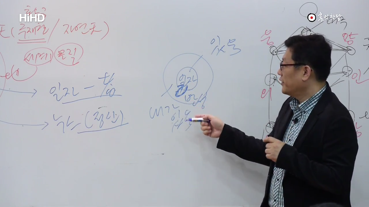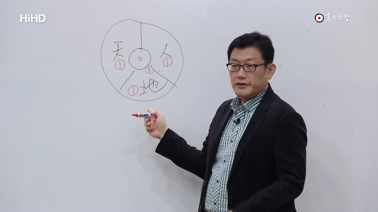 다른 나라도 아닌 우리나라가 뭐 그렇게 수학을 가지고 진리를 설명하려고 했는지, 여기 지금 이렇게 無를 가지고 아무것도 없는 데서 텅 비어있지만 고 놈은 반드시 하나로 작용을 한다. 근데 이 1이 결국 신이란 말이에요. 하느님이라구요. 우주의 뿌리다. 거기서 만물이 다 나온다. 근데 그 1 안에 자세히 들여다보면 1 안에 하늘이 있고 사람이 있고 땅이 있어가지고, 여기다 1은 여기다 쓸게요. 고 안에 들여다 보면 세 기운을 가지고 있다. 우린 음양의 태극만 얘기하는데 우리 민족은 3태극을 얘기하는 겁니다. 3태극. 두 개가 또 싸우는 게 아니에요. 각각 또 접근하는 입장이 다른 거지. 그 하나 안에서 세 기운이 있다. 그래서 이렇게 보시면. 고 내용을 뭐라고 하냐면. 그런데 이 동등한 하나들인 셋은 하나가 그랬듯이 모두 텅 빔을 근본으로 삼는다. 이것들마저도 결국은 0이 본, 이 본바탕이다. 요 얘길 하고 있습니다. 다음에, 天一一 地一二 人一三. 하는 게요 요게 저 뭔 말입니까? 하늘이, 하늘의 하나. 요게 다 하나잖아요. 자. 보세요. 풀면 다 이해하실 수 있습니다. 요게 하나죠?