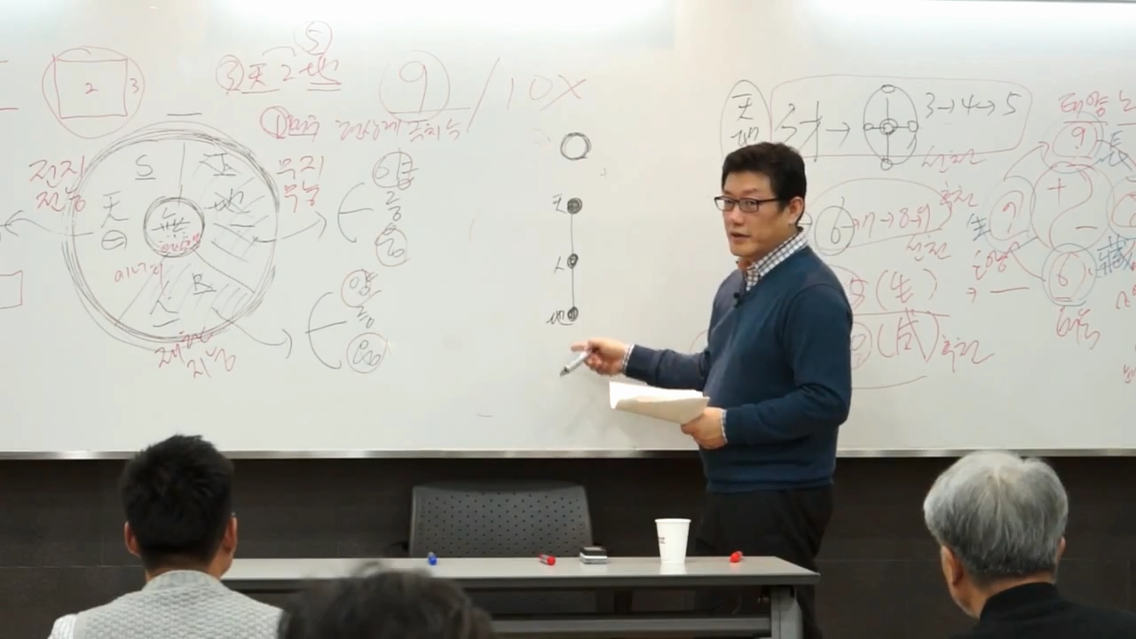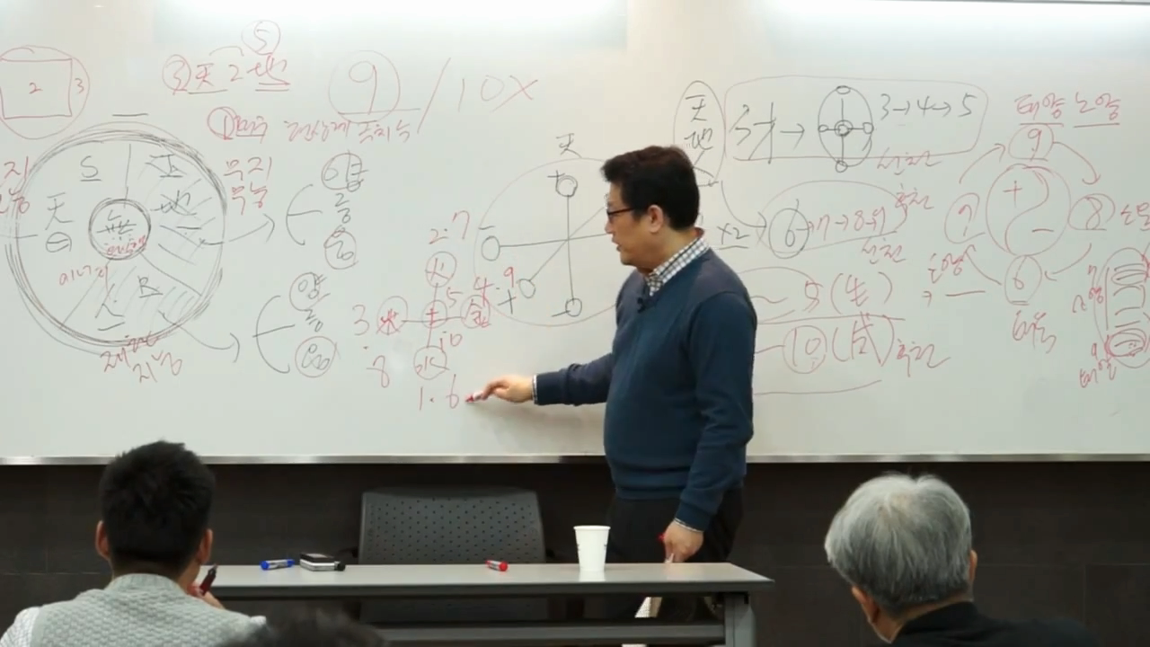 그래서 만물은 윤회를 전제하지 않고는 성장할 수가 없습니다. 이 원리대로라면. 한 번의 이 싸이클로 완성이 되는 게 아니란 말이에요. 끝없이 순환해야 됩니다. 선천적으로 보면 하나에서 열이 모두 선천적인 원상이며. 수리 얘기 조금만 더 합니다. 아주 제가 뽕을 뽑으려고 다 써놨어요. 선천적으로 보면 1에서, 아니 그러면 1부터 5만 선천이고 6부터 10은 무조건 후천입니까? 아니에요. 1부터 10까지가 다 선천일 수도 있고 1부터 10까지가 다 후천일 수도 있어요. 두 개를 비교할 때 굳이 나누면 1부터 5까지가 주로 선천, 6부터 10이 후천이라는 거지. 보세요, 형이상학적인 숫자에 5까지 있는데 10이 없을까요? 10은 무조건 후천일까요? 그게 아니고, 아까 河圖만 해도 선천적인 그림인데 그 안에 10이 다 들어있었잖아요. 그러니까 1부터 5까지가 설명되면 그 안에 이미 10 아니라 수많은 수가 다 이미 내재돼 있죠. 선천적으로 참나 안에 무한한 수가 다 내재돼 있겠죠. 선천적으로 1부터 10도 가능하고, 후천적으로 이건 지금 하나 아닙니까. 이걸 쌓으면 열 개 되겠죠. 후천적으로 1부터 10도 얼마든지 가능하다. 제가 그 얘기를요 혹시나 우려돼서 말씀 드렸고.