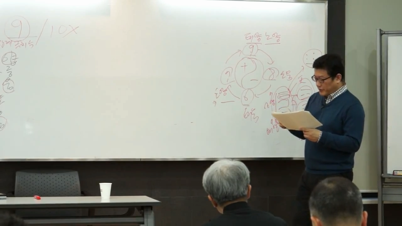 여기만 넘어가세요. 이게 제일 재미없는 부분입니다. 동양의 수리철학을 제가 엑기스만 말로 설명해 놓느라고 다 넣어 놨어요. 그러니까 여기 있는 정도만 계속 음미하시면요 다른 거 더 안 하셔도 그냥 뭐 하도까지, 제가 주역강의 중에 아마 하도 낙서 이런 거 올린 적 있을 텐데 이것까지 모르시더라도 선천수에다 5 더하면 후천수 된다. 정도만 아시면 좋겠습니다. 자 여섯에서 일곱 여덟 아홉이 나오는 과정은 완성이자 종식의 수인 열을 제외하고 보시면요 여섯에서 일곱 여덟 아홉이 이렇게 나오는, 왜 이 말을 했습니까. 三大三合六에서 生七八九라고 했잖아요. 일곱 여덟 아홉이 생긴다. 요게 6이라는 씨알이 육체적인 어떤 물질을 가진 씨알이 형성되면 당연히 싹이 나고 자라고 쪼그라들고 하는 과정도 생기는 거 아닙니까? 그런 의미로 보셔야 돼요. 그냥 읽으시면요 6에서 7 8 9가 나온다. 이게 뭔 경전입니까. 그쵸. 이해되세요? 6에서 7 8 9가 나오느니라. 아~. 이러면 말 한 사람도 이상하고 아~ 한 사람도 이상하고 다 이상한 거죠. 그 의미를 해석 못 하고 이해하시면 이게 아무 의미가 없어요. 이런 게 경전이면 뭐 나도 쓰겠다. 1 더하기 1은 2니라. 뭐 이런 거. 이런 걸 얘기 하는 게 아니거든요. 예. 지금 의미가 이런 겁니다. 여섯에서 일곱 여덟 아홉이 나오는 과정은, 괄호 안에 부분 보시죠. 완성이자 종식의 수인 열을 제외하면, 열을 뺀다는 얘긴 제가 누누이 드려서 이제 아실 거예요. 열은 현실의 영원한 목표로서 의미를 지닙니다. 10은 1의 모든 변화작용의 궁극의 본체이자 목표로서의 0. 요거 말장난 해 놓은 겁니다. 뭔 말장난이냐. 아라비아숫자 10이 꼭 그런 의미로 쓰인 게 아닐 텐데 보세요. 10이, 10의 의미를 제가 이렇게 푼 거예요. 제 마음대로. 1이 0으로 돌아가는 게 10이다. 이해하시기 쉬우라고. 일부러, 의미가 통하니까 그렇게 해 놓은 겁니다. 이해하시기 쉬우라고.